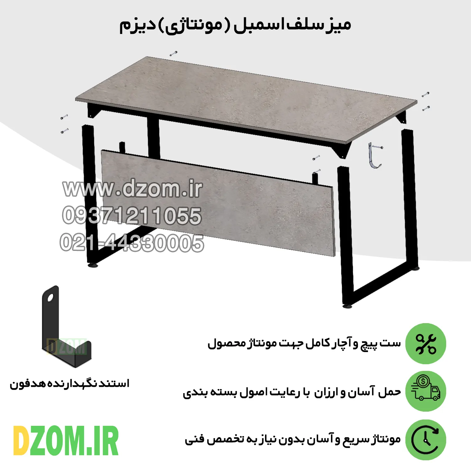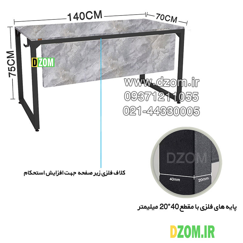 میز اداری دیزم DZOM مدل مونتاژی TLD_front_140×60_GR محصولی مونتاژی، سبک، شیک و در عین حال جذاب و کارآمد از سری تولیدات دیزم میباشد. این محصول بصورت سلف اسمبل (مونتاژی) تولید شده است. این میز حمل و نقل آسان و هزینه حمل مقرون به صرفه ای دارد. مشتری گرامی توجه نمایید برند دیزم (شماره ثبت 414013 اداره ثبت علائم تجاری) هیچگونه نمایندگی فروش در بازارهای فیزیکی و آنلاین نداشته و محصولات خود را با کیفیت و بسته بندی اصلی، مستقیما از طریق سایت Dzom.ir یا شبکه های اجتماعی خود به مصرف کننده (End User) عرضه می نماید. لطفا از خرید کالای تقلبی از سایر فروشندگان خودداری فرمایید. این میز از پایه های فلزی با مقطع 20×40 میلیمتر و رنگ رویه الکترواستاتیک با ماندگاری و دوام بالا ساخته شده است. همچنین پایه های پیچی، قابلیت تنظیم نسبت به سطح زمین را دارد تا بهترین تراز جهت جلوگیری از تکان خوردن را ایجاد نماید. صفحه میز از جنس MDF درجه یک به رنگ طوسی می باشد. این محصول با طول 140cm، عرض 60cm و ارتفاع 75cm عرضه می شود. به این نکته توجه شود که تنوع رنگ انتخابی کالا تنها مربوط به رنگ پایه های فلزی میباشد.