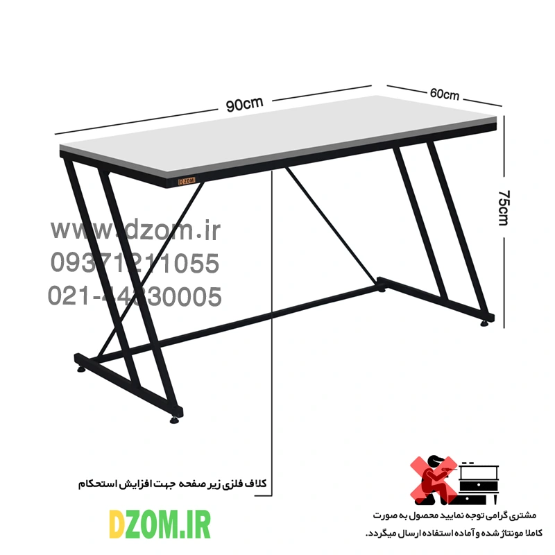 میز دیزم DZom مدل TLD-77E25-90WONE محصولی سبک، شیک و در عین حال جذاب و کارآمد از سری تولیدات دیزم میباشد. مشتری گرامی توجه نمایید برند دیزم (شماره ثبت 414013 اداره ثبت علائم تجاری) هیچگونه نمایندگی فروش در بازارهای فیزیکی و آنلاین نداشته و محصولات خود را با کیفیت و بسته بندی اصلی، مستقیما از طریق سایت Dzom.ir یا شبکه های اجتماعی خود به مصرف کننده (End User) عرضه می نماید. لطفا از خرید کالای تقلبی از سایر فروشندگان خودداری فرمایید. این میز از پایه های فلزی با رنگ رویه الکترواستاتیک با ماندگاری و دوام بالا ساخته شده است. همچنین پایه های پیچی، قابلیت تنظیم نسبت به سطح زمین را دارد تا بهترین تراز جهت جلوگیری از تکان خوردن را ایجاد نماید. صفحه میز از جنس MDF درجه یک برجسته طرح چوب به رنگ سفید می باشد. این محصول با طول 90cm، عرض 60cm و ارتفاع 75cm عرضه می شود. به این نکته توجه شود که تنوع رنگ انتخابی کالا تنها مربوط به رنگ پایه های فلزی میباشد و محصول به صورت کاملا مونتاژ شده و آماده استفاده برای مشتریان ارسال می گردد.