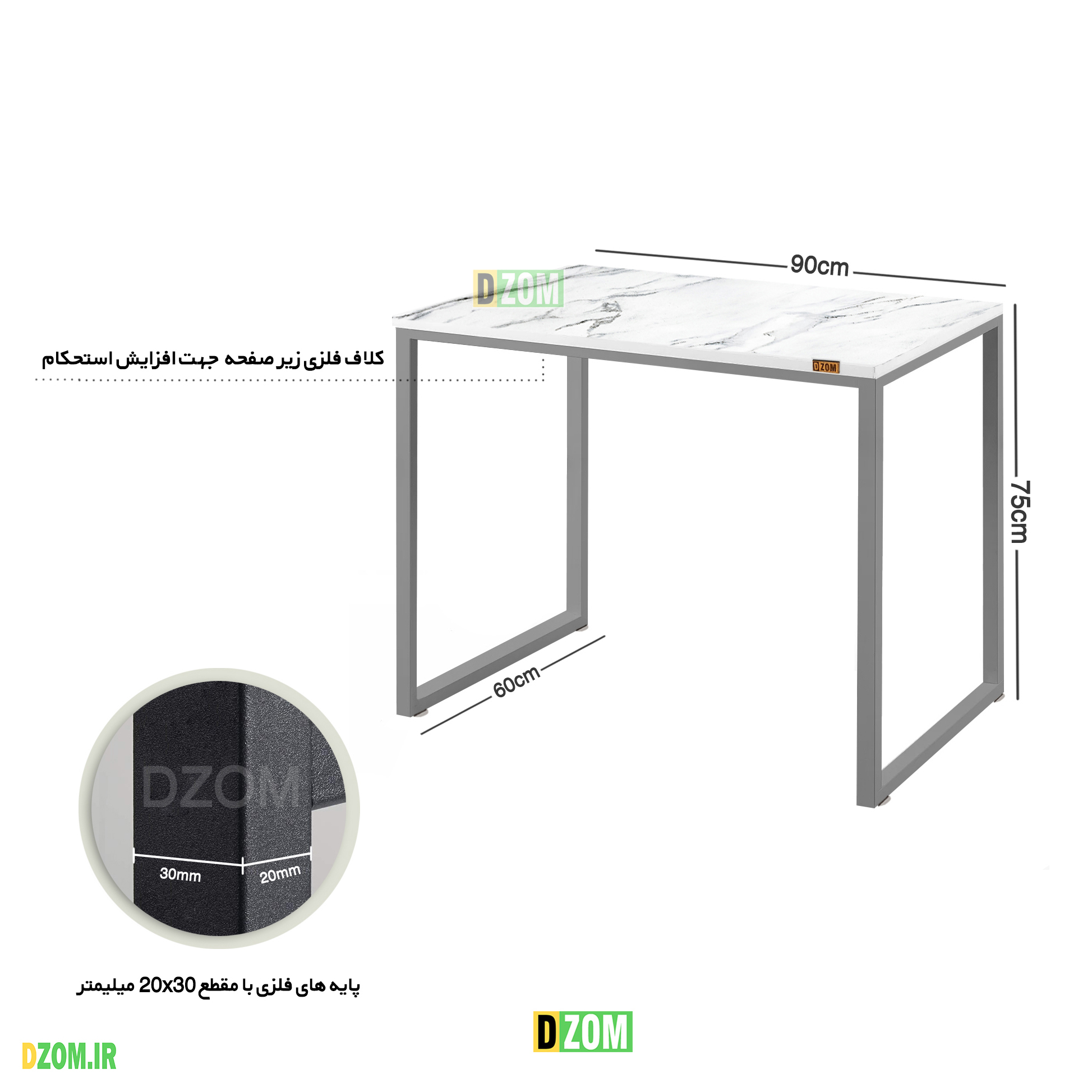میز دیزم DZom مدل TLD-93D43-90SW محصولی سبک، شیک و در عین حال جذاب و کارآمد از سری تولیدات دیزم میباشد. مشتری گرامی توجه نمایید محصولات برند دیزم (شماره ثبت 414013 اداره ثبت علائم تجاری) با کیفیت و بسته بندی اصلی تنها توسط فروشنده رسمی دیزم در دیجی کالا عرضه می گردد، لطفا از خرید کالای تقلبی از سایر فروشندگان خودداری فرمایید. برند دیزم هیچگونه نمایندگی فروش در بازارهای فیزیکی و آنلاین نداشته و محصولات خود را مستقیما از طریق سایت Dzom.ir یا شبکه های اجتماعی خود به مصرف کننده (End User) عرضه می نماید. این میز که قابلیت استفاده به عنوان میز تحریر، میز کامپیوتر، میز جلسه، میز کار و حتی به عنوان یک میز اداری را دارد، از پایه های فلزی با مقطع 20×30 میلیمتر و رنگ رویه الکترواستاتیک با ماندگاری و دوام بالا ساخته شده است. همچنین پایه های پیچی، قابلیت تنظیم نسبت به سطح زمین را دارد تا بهترین تراز جهت جلوگیری از تکان خوردن را ایجاد نماید. صفحه میز از جنس MDF درجه یک طرح سنگ و به رنگ سفید می باشد. این محصول با طول 90cm، عرض 60cm و ارتفاع 75cm عرضه می شود. به این نکته توجه شود که تنوع رنگ انتخابی کالا تنها مربوط به رنگ پایه های فلزی میباشد و محصول به صورت کاملا مونتاژ شده و آماده استفاده برای مشتریان ارسال می گردد.