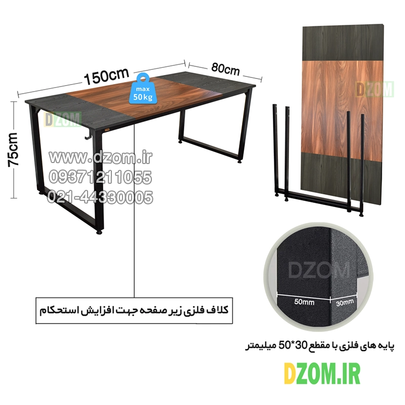 میز تحریر دیزم DZom مدل مونتاژی WD_asm_150×80_Tri_BABRN محصولی مونتاژی، سبک، شیک و در عین حال جذاب و کارآمد از سری تولیدات دیزم میباشد. مشتری گرامی توجه نمایید برند دیزم (شماره ثبت 414013 اداره ثبت علائم تجاری) هیچگونه نمایندگی فروش در بازارهای فیزیکی و آنلاین نداشته و محصولات خود را با کیفیت و بسته بندی اصلی، مستقیما از طریق سایت Dzom.ir یا شبکه های اجتماعی خود به مصرف کننده (End User) عرضه می نماید. لطفا از خرید کالای تقلبی از سایر فروشندگان خودداری فرمایید. این محصول بصورت سلف اسمبل (مونتاژی) تولید شده است. این میز حمل و نقل آسان و هزینه حمل مقرون به صرفه ای دارد. این میز از پایه های فلزی با مقطع 50×30 میلیمتر و رنگ رویه الکترواستاتیک با ماندگاری و دوام بالا ساخته شده است. همچنین پایه های پیچی، قابلیت تنظیم نسبت به سطح زمین را دارد تا بهترین تراز جهت جلوگیری از تکان خوردن را ایجاد نماید. صفحه میز از جنس MDF درجه یک برجسته طرح چوب با ترکیبی از دو رنگ مشکی و قهوه‌ای می باشد. این محصول با طول 150cm، عرض 80cm و ارتفاع 75cm عرضه می شود. به این نکته توجه شود که تنوع رنگ انتخابی کالا تنها مربوط به رنگ پایه های فلزی میباشد.