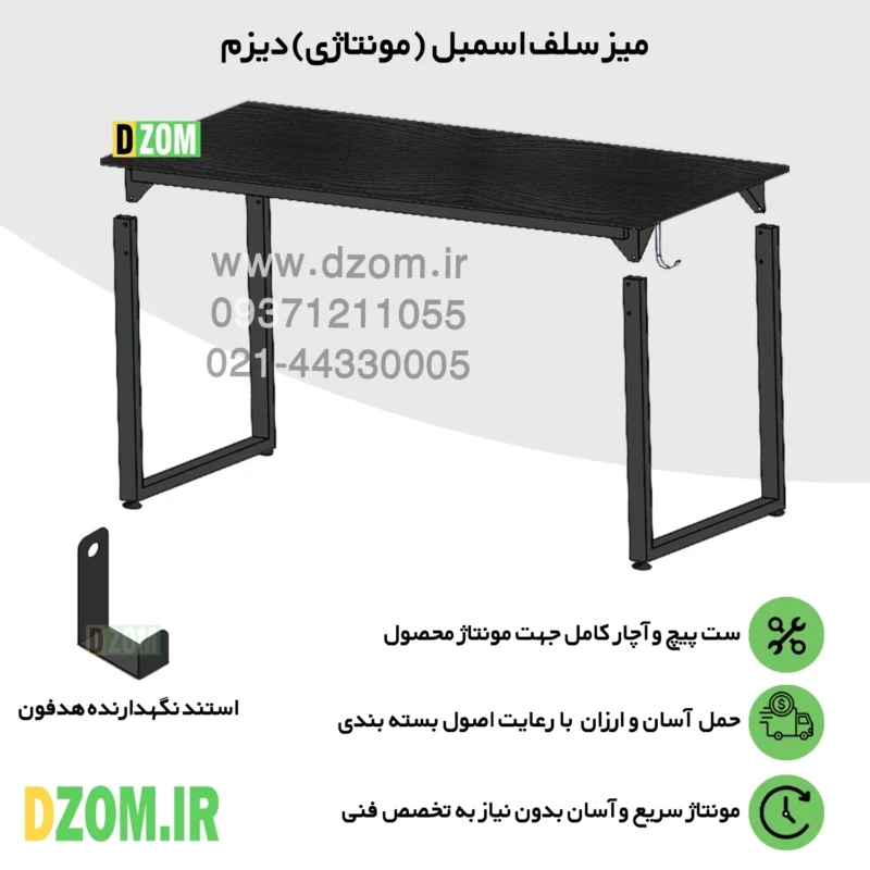 میز تحریر دیزم DZom مدل مونتاژی WD_asm_90×60_B محصولی مونتاژی، سبک، شیک و در عین حال جذاب و کارآمد از سری تولیدات دیزم میباشد. مشتری گرامی توجه نمایید برند دیزم (شماره ثبت 414013 اداره ثبت علائم تجاری) هیچگونه نمایندگی فروش در بازارهای فیزیکی و آنلاین نداشته و محصولات خود را با کیفیت و بسته بندی اصلی، مستقیما از طریق سایت Dzom.ir یا شبکه های اجتماعی خود به مصرف کننده (End User) عرضه می نماید. لطفا از خرید کالای تقلبی از سایر فروشندگان خودداری فرمایید. این محصول بصورت سلف اسمبل (مونتاژی) تولید شده است. این میز حمل و نقل آسان و هزینه حمل مقرون به صرفه ای دارد. این میز از پایه های فلزی با مقطع 30×20 میلیمتر و رنگ رویه الکترواستاتیک با ماندگاری و دوام بالا ساخته شده است. همچنین پایه های پیچی، قابلیت تنظیم نسبت به سطح زمین را دارد تا بهترین تراز جهت جلوگیری از تکان خوردن را ایجاد نماید. صفحه میز از جنس MDF درجه یک برجسته طرح چوب و به رنگ مشکی می باشد. این محصول با طول 90cm، عرض 60cm و ارتفاع 75cm عرضه می شود. به این نکته توجه شود که تنوع رنگ انتخابی کالا تنها مربوط به رنگ پایه های فلزی میباشد.