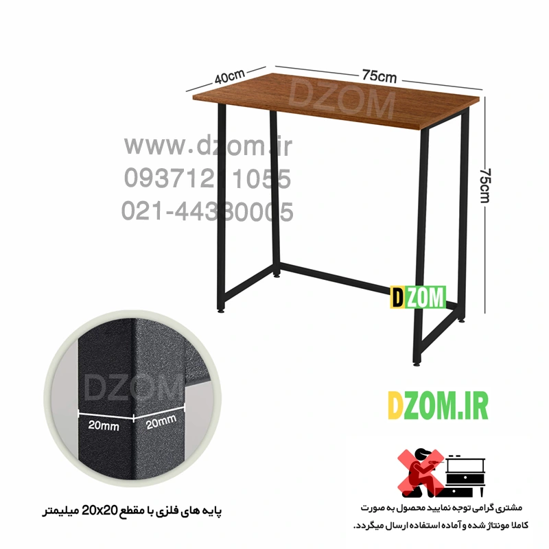 میز تحریر دیزم DZom مدل CD_J100_75_BRN محصولی سبک، شیک و در عین حال جذاب و کارآمد از سری تولیدات دیزم میباشد. مشتری گرامی توجه نمایید برند دیزم (شماره ثبت 414013 اداره ثبت علائم تجاری) هیچگونه نمایندگی فروش در بازارهای فیزیکی و آنلاین نداشته و محصولات خود را با کیفیت و بسته بندی اصلی، مستقیما از طریق سایت Dzom.ir یا شبکه های اجتماعی خود به مصرف کننده (End User) عرضه می نماید. لطفا از خرید کالای تقلبی از سایر فروشندگان خودداری فرمایید. این محصول از پایه های فلزی با مقطع 20×20 میلیمتر و رنگ رویه الکترواستاتیک با ماندگاری و دوام بالا ساخته شده است. همچنین پایه های پیچی، قابلیت تنظیم نسبت به سطح زمین را دارد تا بهترین تراز جهت جلوگیری از تکان خوردن را ایجاد نماید. صفحه محصول از جنس MDF درجه یک برجسته طرح چوب و به رنگ قهوه ای می باشد. این محصول با طول 75cm، عرض 40cm و ارتفاع 75cm عرضه می شود. به این نکته توجه شود که تنوع رنگ انتخابی کالا تنها مربوط به رنگ پایه های فلزی میباشد