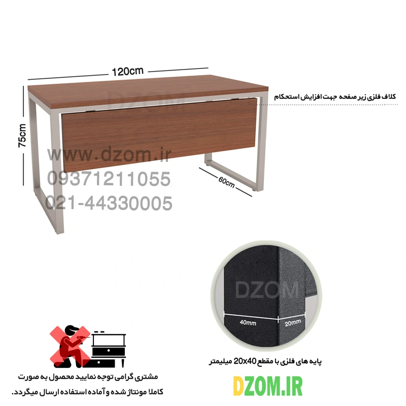 میز دیزم DZom مدل WD-11J41-120BRNONE محصولی سبک، شیک و در عین حال جذاب و کارآمد از سری تولیدات دیزم میباشد. مشتری گرامی توجه نمایید برند دیزم (شماره ثبت 414013 اداره ثبت علائم تجاری) هیچگونه نمایندگی فروش در بازارهای فیزیکی و آنلاین نداشته و محصولات خود را با کیفیت و بسته بندی اصلی، مستقیما از طریق سایت Dzom.ir یا شبکه های اجتماعی خود به مصرف کننده (End User) عرضه می نماید. لطفا از خرید کالای تقلبی از سایر فروشندگان خودداری فرمایید. این میز که قابلیت استفاده به عنوان میز تحریر، میز کامپیوتر، میز جلسه، میز کار و حتی به عنوان یک میز اداری را دارد، از پایه های فلزی با مقطع 20×40 میلیمتر و رنگ رویه الکترواستاتیک با ماندگاری و دوام بالا ساخته شده است. همچنین پایه های پیچی، قابلیت تنظیم نسبت به سطح زمین را دارد تا بهترین تراز جهت جلوگیری از تکان خوردن را ایجاد نماید. صفحه میز از جنس MDF درجه یک برجسته طرح چوب و به رنگ قهوه ای می باشد. این محصول با طول 120cm، عرض 60cm و ارتفاع 75cm عرضه می شود. به این نکته توجه شود که تنوع رنگ انتخابی کالا تنها مربوط به رنگ پایه های فلزی میباشد و محصول به صورت کاملا مونتاژ شده و آماده استفاده برای مشتریان ارسال می گردد.