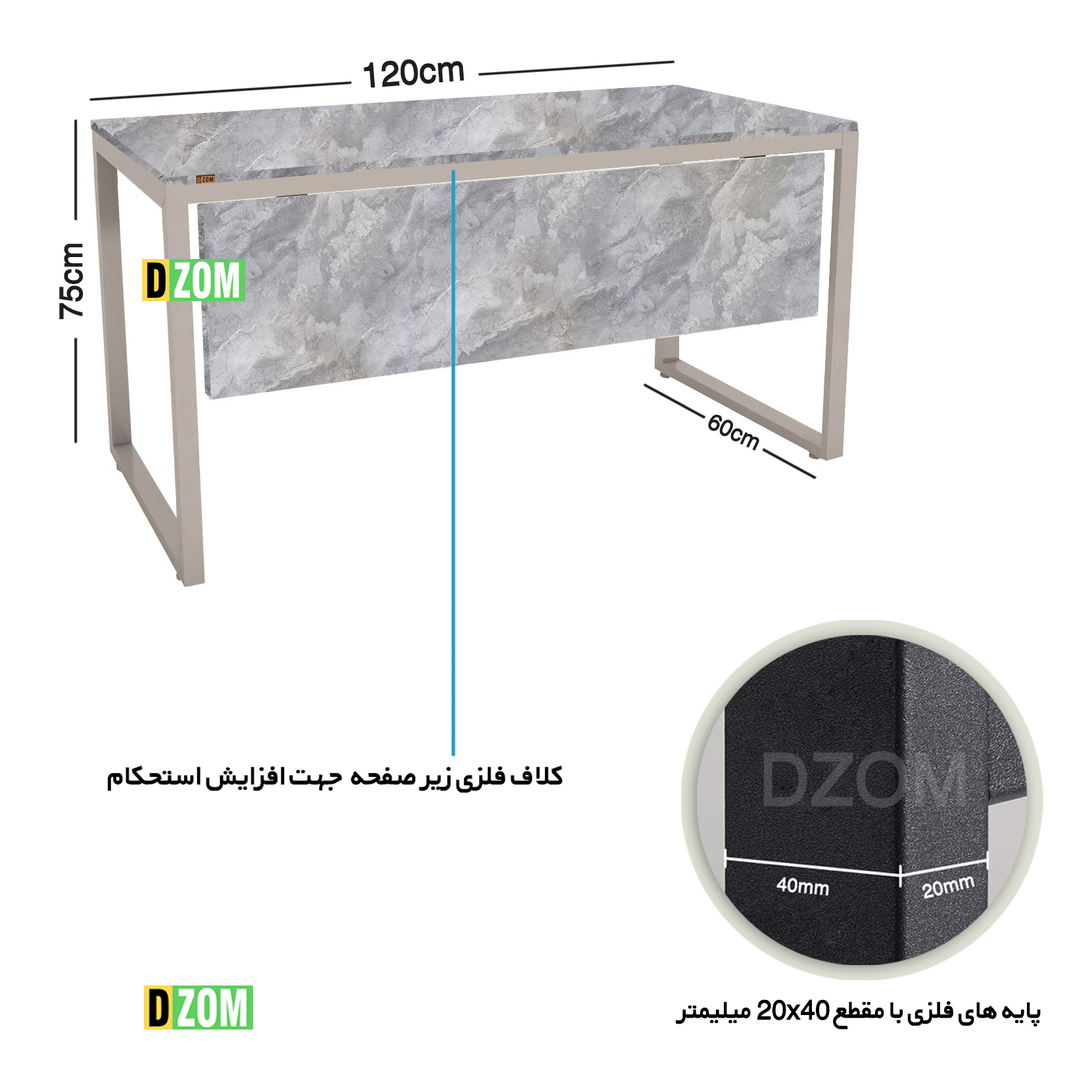 میز دیزم DZom مدل WD-11J41-120GRONE محصولی سبک، شیک و در عین حال جذاب و کارآمد از سری تولیدات دیزم میباشد. مشتری گرامی توجه نمایید محصولات برند دیزم (شماره ثبت 414013 اداره ثبت علائم تجاری) با کیفیت و بسته بندی اصلی تنها توسط فروشنده رسمی دیزم در دیجی کالا عرضه می گردد، لطفا از خرید کالای تقلبی از سایر فروشندگان خودداری فرمایید. برند دیزم هیچگونه نمایندگی فروش در بازارهای فیزیکی و آنلاین نداشته و محصولات خود را مستقیما از طریق سایت Dzom.ir یا شبکه های اجتماعی خود به مصرف کننده (End user) عرضه می نماید. این میز که قابلیت استفاده به عنوان میز تحریر، میز کامپیوتر، میز جلسه، میز کار و حتی به عنوان یک میز اداری را دارد، از پایه های فلزی با مقطع 20×40 میلیمتر و رنگ رویه الکترواستاتیک با ماندگاری و دوام بالا ساخته شده است. همچنین پایه های پیچی، قابلیت تنظیم نسبت به سطح زمین را دارد تا بهترین تراز جهت جلوگیری از تکان خوردن را ایجاد نماید. صفحه میز از جنس MDF درجه یک برجسته به رنگ طوسی می باشد. این محصول با طول 120cm، عرض 60cm و ارتفاع 75cm عرضه می شود. به این نکته توجه شود که تنوع رنگ انتخابی کالا تنها مربوط به رنگ پایه های فلزی میباشد و محصول به صورت کاملا مونتاژ شده و آماده استفاده برای مشتریان ارسال می گردد.