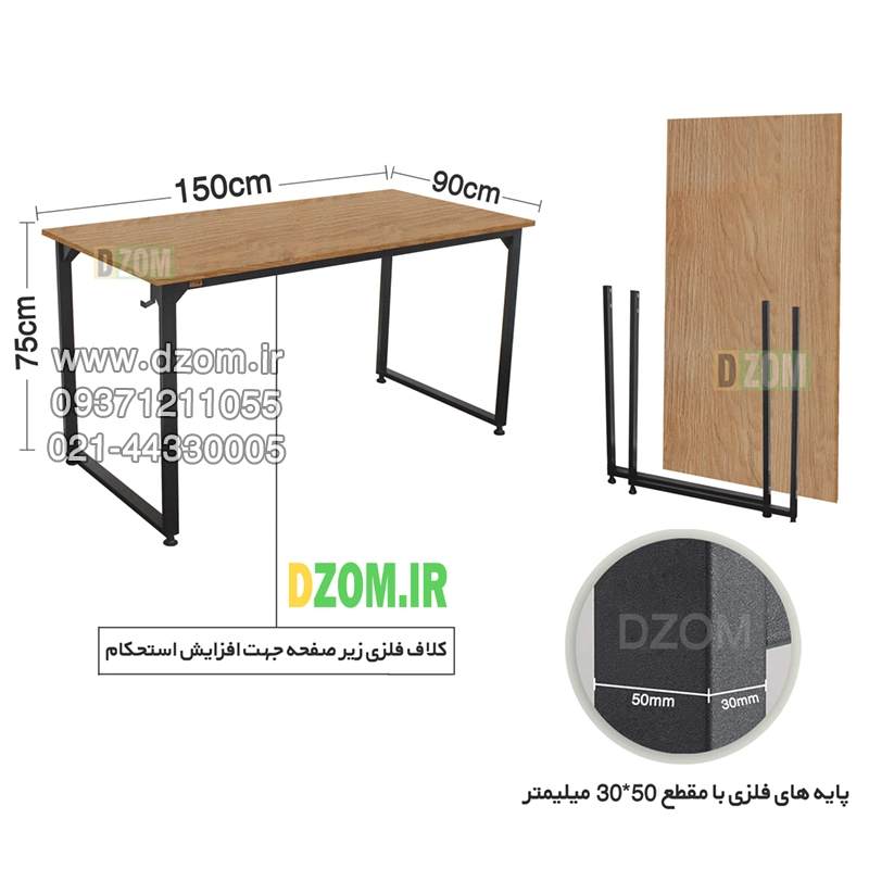 میز تحریر دیزم DZom مدل مونتاژی WD_asm_150×90_LIGHT محصولی مونتاژی، سبک، شیک و در عین حال جذاب و کارآمد از سری تولیدات دیزم میباشد. مشتری گرامی توجه نمایید برند دیزم (شماره ثبت 414013 اداره ثبت علائم تجاری) هیچگونه نمایندگی فروش در بازارهای فیزیکی و آنلاین نداشته و محصولات خود را با کیفیت و بسته بندی اصلی، مستقیما از طریق سایت Dzom.ir یا شبکه های اجتماعی خود به مصرف کننده (End User) عرضه می نماید. لطفا از خرید کالای تقلبی از سایر فروشندگان خودداری فرمایید. این محصول بصورت سلف اسمبل (مونتاژی) تولید شده است. این میز حمل و نقل آسان و هزینه حمل مقرون به صرفه ای دارد. این میز از پایه های فلزی با مقطع 50×30 میلیمتر و رنگ رویه الکترواستاتیک با ماندگاری و دوام بالا ساخته شده است. همچنین پایه های پیچی، قابلیت تنظیم نسبت به سطح زمین را دارد تا بهترین تراز جهت جلوگیری از تکان خوردن را ایجاد نماید. صفحه میز از جنس MDF درجه یک برجسته طرح چوب به رنگ قهوه ای روشن می باشد. این محصول با طول 150cm، عرض 90cm و ارتفاع 75cm عرضه می شود. به این نکته توجه شود که تنوع رنگ انتخابی کالا تنها مربوط به رنگ پایه های فلزی میباشد.