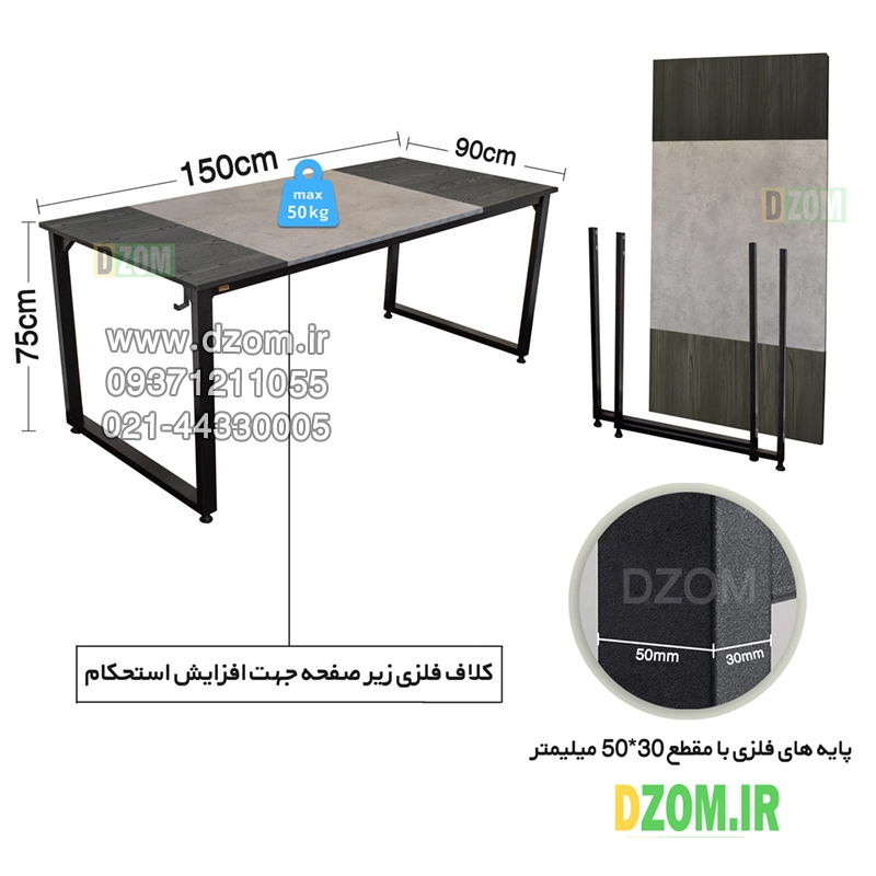 میز تحریر دیزم DZom مدل مونتاژی WD_asm_150×90_Tri_BAGR محصولی مونتاژی، سبک، شیک و در عین حال جذاب و کارآمد از سری تولیدات دیزم میباشد. این محصول بصورت سلف اسمبل (مونتاژی) تولید شده است. مشتری گرامی توجه نمایید برند دیزم (شماره ثبت 414013 اداره ثبت علائم تجاری) هیچگونه نمایندگی فروش در بازارهای فیزیکی و آنلاین نداشته و محصولات خود را با کیفیت و بسته بندی اصلی، مستقیما از طریق سایت Dzom.ir یا شبکه های اجتماعی خود به مصرف کننده (End User) عرضه می نماید. لطفا از خرید کالای تقلبی از سایر فروشندگان خودداری فرمایید. این میز حمل و نقل آسان و هزینه حمل مقرون به صرفه ای دارد. این میز از پایه های فلزی با مقطع 50×30 میلیمتر و رنگ رویه الکترواستاتیک با ماندگاری و دوام بالا ساخته شده است. همچنین پایه های پیچی، قابلیت تنظیم نسبت به سطح زمین را دارد تا بهترین تراز جهت جلوگیری از تکان خوردن را ایجاد نماید. صفحه میز ترکیبی از MDF درجه یک برجسته طرح چوب به رنگ مشکی و MDF درجه یک به رنگ طوسی می باشد. این محصول با طول 150cm، عرض 90cm و ارتفاع 75cm عرضه می شود. به این نکته توجه شود که تنوع رنگ انتخابی کالا تنها مربوط به رنگ پایه های فلزی میباشد.