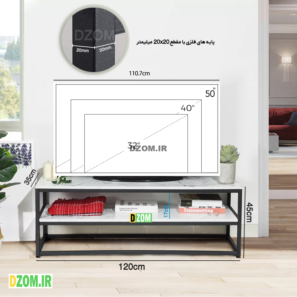 میز تلویزیون دیزم DZom مدل TVS-63H09-120SW محصولی سبک، شیک و در عین حال جذاب و کارآمد از سری تولیدات دیزم میباشد. مشتری گرامی توجه نمایید محصولات برند دیزم (شماره ثبت 414013 اداره ثبت علائم تجاری) با کیفیت و بسته بندی اصلی تنها توسط فروشنده رسمی دیزم در دیجی کالا عرضه می گردد، لطفا از خرید کالای تقلبی از سایر فروشندگان خودداری فرمایید. برند دیزم هیچگونه نمایندگی فروش در بازارهای فیزیکی و آنلاین نداشته و محصولات خود را مستقیما از طریق سایت Dzom.ir یا شبکه های اجتماعی خود به مصرف کننده (End user) عرضه می نماید. این محصول از پایه های فلزی با مقطع 20×20 میلیمتر و رنگ رویه الکترواستاتیک با ماندگاری و دوام بالا ساخته شده است. همچنین پایه های پیچی، قابلیت تنظیم نسبت به سطح زمین را دارد تا بهترین تراز جهت جلوگیری از تکان خوردن را ایجاد نماید. صفحه محصول از جنس MDF درجه یک طرح سنگ و به رنگ سفید می باشد. این محصول با طول 120cm، عرض 35cm و ارتفاع 45cm عرضه می شود. به این نکته توجه شود که تنوع رنگ انتخابی کالا تنها مربوط به رنگ پایه های فلزی میباشد و محصول به صورت کاملا مونتاژ شده و آماده استفاده برای مشتریان ارسال می گردد.