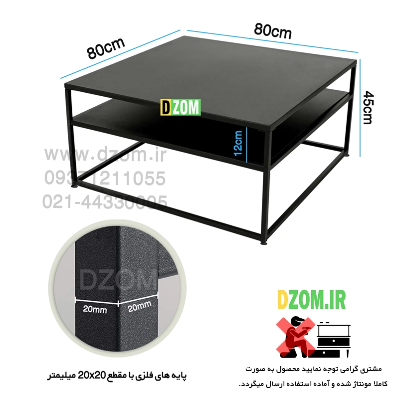 میز جلومبلی دیزم DZom مدل CO_D100_80_B محصولی سبک، شیک و در عین حال جذاب و کارآمد از سری تولیدات دیزم میباشد. مشتری گرامی توجه نمایید برند دیزم (شماره ثبت 414013 اداره ثبت علائم تجاری) هیچگونه نمایندگی فروش در بازارهای فیزیکی و آنلاین نداشته و محصولات خود را با کیفیت و بسته بندی اصلی، مستقیما از طریق سایت Dzom.ir یا شبکه های اجتماعی خود به مصرف کننده (End User) عرضه می نماید. لطفا از خرید کالای تقلبی از سایر فروشندگان خودداری فرمایید. این محصول از پایه های فلزی با مقطع 20×20 میلیمتر و رنگ رویه الکترواستاتیک با ماندگاری و دوام بالا ساخته شده است. همچنین پایه های پیچی، قابلیت تنظیم نسبت به سطح زمین را دارد تا بهترین تراز جهت جلوگیری از تکان خوردن را ایجاد نماید. صفحه محصول از جنس MDF درجه یک برجسته طرح چوب و به رنگ مشکی می باشد. این محصول با طول 80cm، عرض 80cm و ارتفاع 45cm عرضه می شود. به این نکته توجه شود که تنوع رنگ انتخابی کالا تنها مربوط به رنگ پایه های فلزی میباشد و محصول به صورت کاملا مونتاژ شده و آماده استفاده برای مشتریان ارسال می گردد.