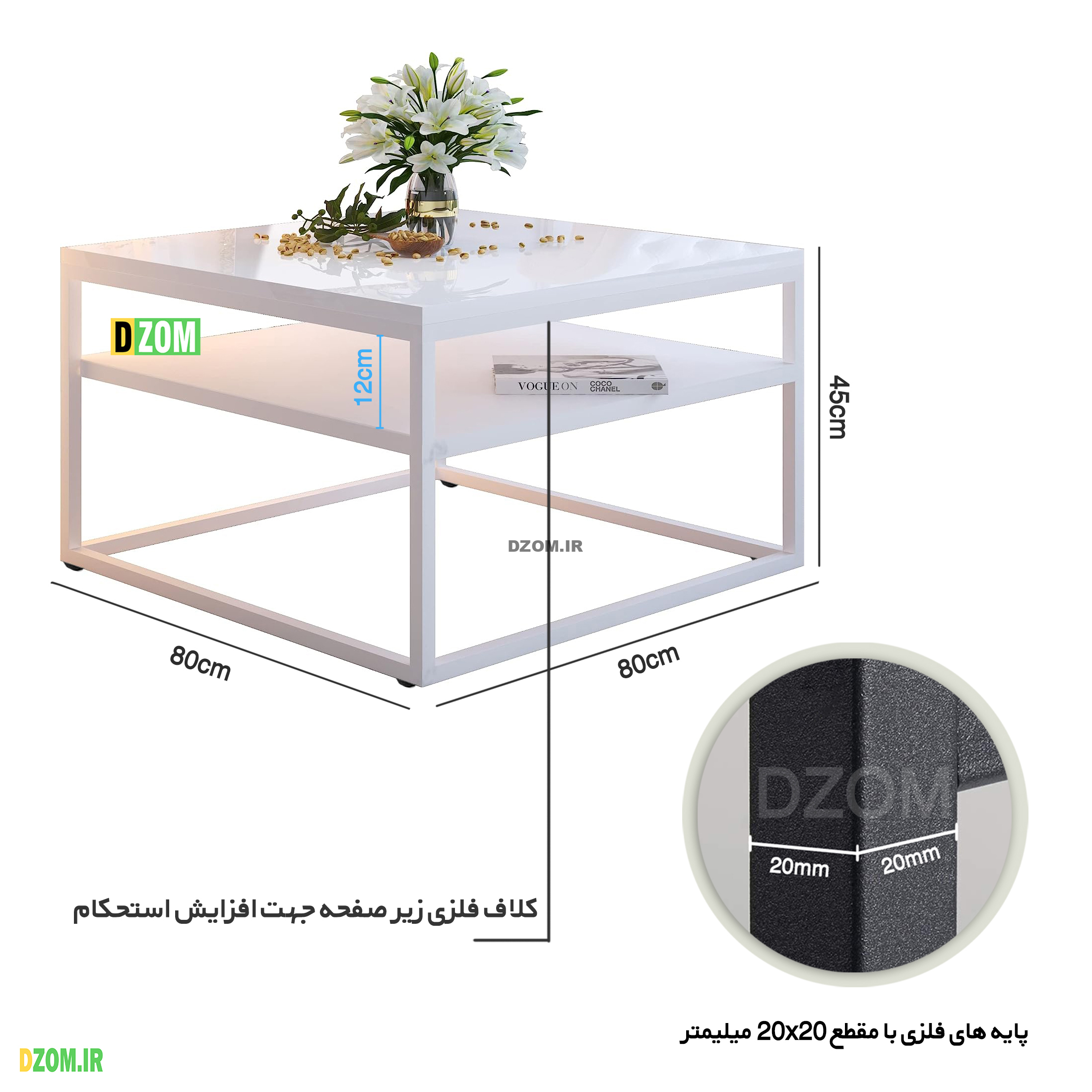 میز جلومبلی دیزم DZom مدل CO_D100_80_W محصولی سبک، شیک و در عین حال جذاب و کارآمد از سری تولیدات دیزم میباشد. مشتری گرامی توجه نمایید محصولات برند دیزم (شماره ثبت 414013 اداره ثبت علائم تجاری) با کیفیت و بسته بندی اصلی تنها توسط فروشنده رسمی دیزم در دیجی کالا عرضه می گردد، لطفا از خرید کالای تقلبی از سایر فروشندگان خودداری فرمایید. برند دیزم هیچگونه نمایندگی فروش در بازارهای فیزیکی و آنلاین نداشته و محصولات خود را مستقیما از طریق سایت Dzom.ir یا شبکه های اجتماعی خود به مصرف کننده (End User) عرضه می نماید. این محصول از پایه های فلزی با مقطع 20×20 میلیمتر و رنگ رویه الکترواستاتیک با ماندگاری و دوام بالا ساخته شده است. همچنین پایه های پیچی، قابلیت تنظیم نسبت به سطح زمین را دارد تا بهترین تراز جهت جلوگیری از تکان خوردن را ایجاد نماید. صفحه محصول از جنس MDF درجه یک برجسته طرح چوب و به رنگ سفید می باشد. این محصول با طول 80cm، عرض 80cm و ارتفاع 45cm عرضه می شود. به این نکته توجه شود که تنوع رنگ انتخابی کالا تنها مربوط به رنگ پایه های فلزی میباشد و محصول به صورت کاملا مونتاژ شده و آماده استفاده برای مشتریان ارسال می گردد.
