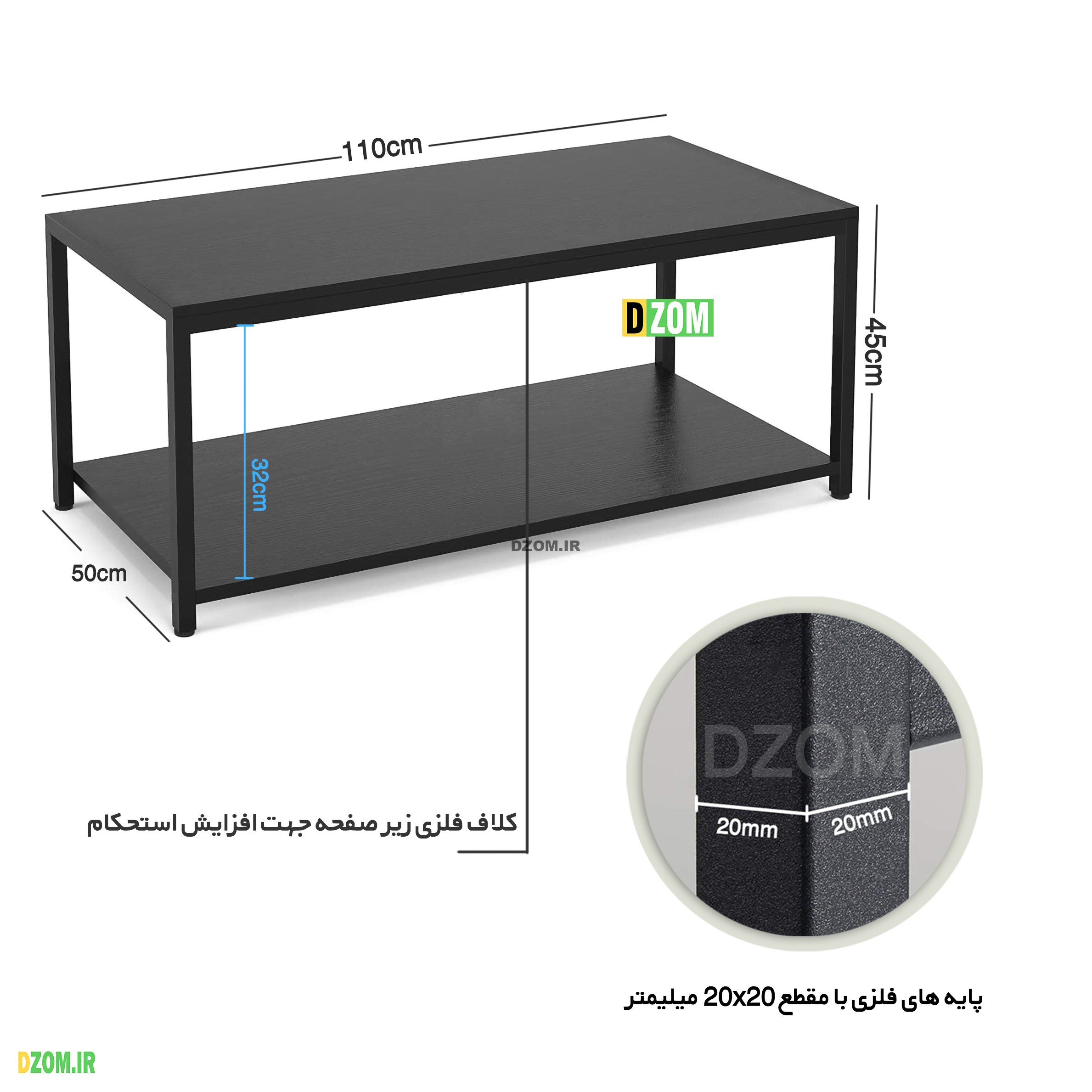 میز جلومبلی دیزم DZom مدل CO_E100_110_B محصولی سبک، شیک و در عین حال جذاب و کارآمد از سری تولیدات دیزم میباشد. مشتری گرامی توجه نمایید محصولات برند دیزم (شماره ثبت 414013 اداره ثبت علائم تجاری) با کیفیت و بسته بندی اصلی تنها توسط فروشنده رسمی دیزم در دیجی کالا عرضه می گردد، لطفا از خرید کالای تقلبی از سایر فروشندگان خودداری فرمایید. برند دیزم هیچگونه نمایندگی فروش در بازارهای فیزیکی و آنلاین نداشته و محصولات خود را مستقیما از طریق سایت Dzom.ir یا شبکه های اجتماعی خود به مصرف کننده (End User) عرضه می نماید. این میز از پایه های فلزی با مقطع 20×20 میلیمتر و رنگ رویه الکترواستاتیک با ماندگاری و دوام بالا ساخته شده است. همچنین پایه های پیچی، قابلیت تنظیم نسبت به سطح زمین را دارد تا بهترین تراز جهت جلوگیری از تکان خوردن را ایجاد نماید. صفحه میز از جنس MDF درجه یک برجسته طرح چوب به رنگ مشکی می باشد. این محصول با طول 110cm، عرض 50cm و ارتفاع 45cm عرضه می شود. به این نکته توجه شود که تنوع رنگ انتخابی کالا تنها مربوط به رنگ پایه های فلزی میباشد و محصول به صورت کاملا مونتاژ شده و آماده استفاده برای مشتریان ارسال می گردد.