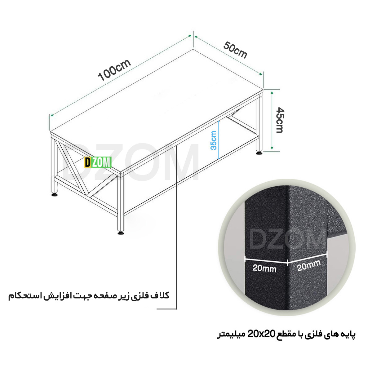 میز جلومبلی دیزم DZom مدل CO_G200_100_B محصولی سبک، شیک و در عین حال جذاب و کارآمد از سری تولیدات دیزم میباشد. مشتری گرامی توجه نمایید محصولات برند دیزم (شماره ثبت 414013 اداره ثبت علائم تجاری) با کیفیت و بسته بندی اصلی تنها توسط فروشنده رسمی دیزم در دیجی کالا عرضه می گردد، لطفا از خرید کالای تقلبی از سایر فروشندگان خودداری فرمایید. برند دیزم هیچگونه نمایندگی فروش در بازارهای فیزیکی و آنلاین نداشته و محصولات خود را مستقیما از طریق سایت Dzom.ir یا شبکه های اجتماعی خود به مصرف کننده (End User) عرضه می نماید. این میز از پایه های فلزی با مقطع 20×20 میلیمتر و رنگ رویه الکترواستاتیک با ماندگاری و دوام بالا ساخته شده است. همچنین پایه های پیچی، قابلیت تنظیم نسبت به سطح زمین را دارد تا بهترین تراز جهت جلوگیری از تکان خوردن را ایجاد نماید. صفحه میز از جنس MDF درجه یک برجسته طرح چوب به رنگ مشکی می باشد. این محصول با طول 100cm، عرض 50cm و ارتفاع 45cm عرضه می شود. به این نکته توجه شود که تنوع رنگ انتخابی کالا تنها مربوط به رنگ پایه های فلزی میباشد و محصول به صورت کاملا مونتاژ شده و آماده استفاده برای مشتریان ارسال می گردد.