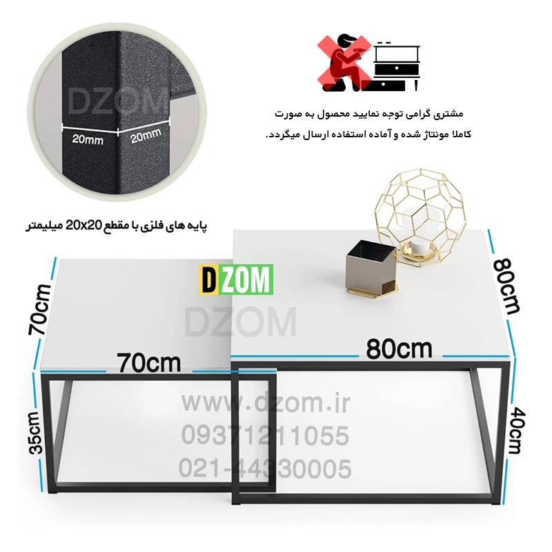 مجموعه دو عددی میز جلو مبلی اداری دیزم DZOM مدل OF_H100_80_W محصولی سبک، شیک و در عین حال جذاب و کارآمد از سری تولیدات دیزم میباشد. مشتری گرامی توجه نمایید برند دیزم (شماره ثبت 414013 اداره ثبت علائم تجاری) هیچگونه نمایندگی فروش در بازارهای فیزیکی و آنلاین نداشته و محصولات خود را با کیفیت و بسته بندی اصلی، مستقیما از طریق سایت Dzom.ir یا شبکه های اجتماعی خود به مصرف کننده (End User) عرضه می نماید. لطفا از خرید کالای تقلبی از سایر فروشندگان خودداری فرمایید. این میز از پایه های فلزی با مقطع 20×20 میلیمتر و رنگ رویه الکترواستاتیک با ماندگاری و دوام بالا ساخته شده است و دارای پایه های لاستیکی می باشد. صفحه میز از جنس MDF درجه یک برجسته طرح چوب و به رنگ سفید می باشد. این محصول شامل یک میز بزرگ با طول 80cm، عرض 80cm و ارتفاع 40cm و یک میز کوچک با طول 70cm، عرض 70cm و ارتفاع 35cm می باشد. به این نکته توجه شود که تنوع رنگ انتخابی کالا تنها مربوط به رنگ پایه های فلزی میباشد و محصول به صورت کاملا مونتاژ شده و آماده استفاده برای مشتریان ارسال می گردد.