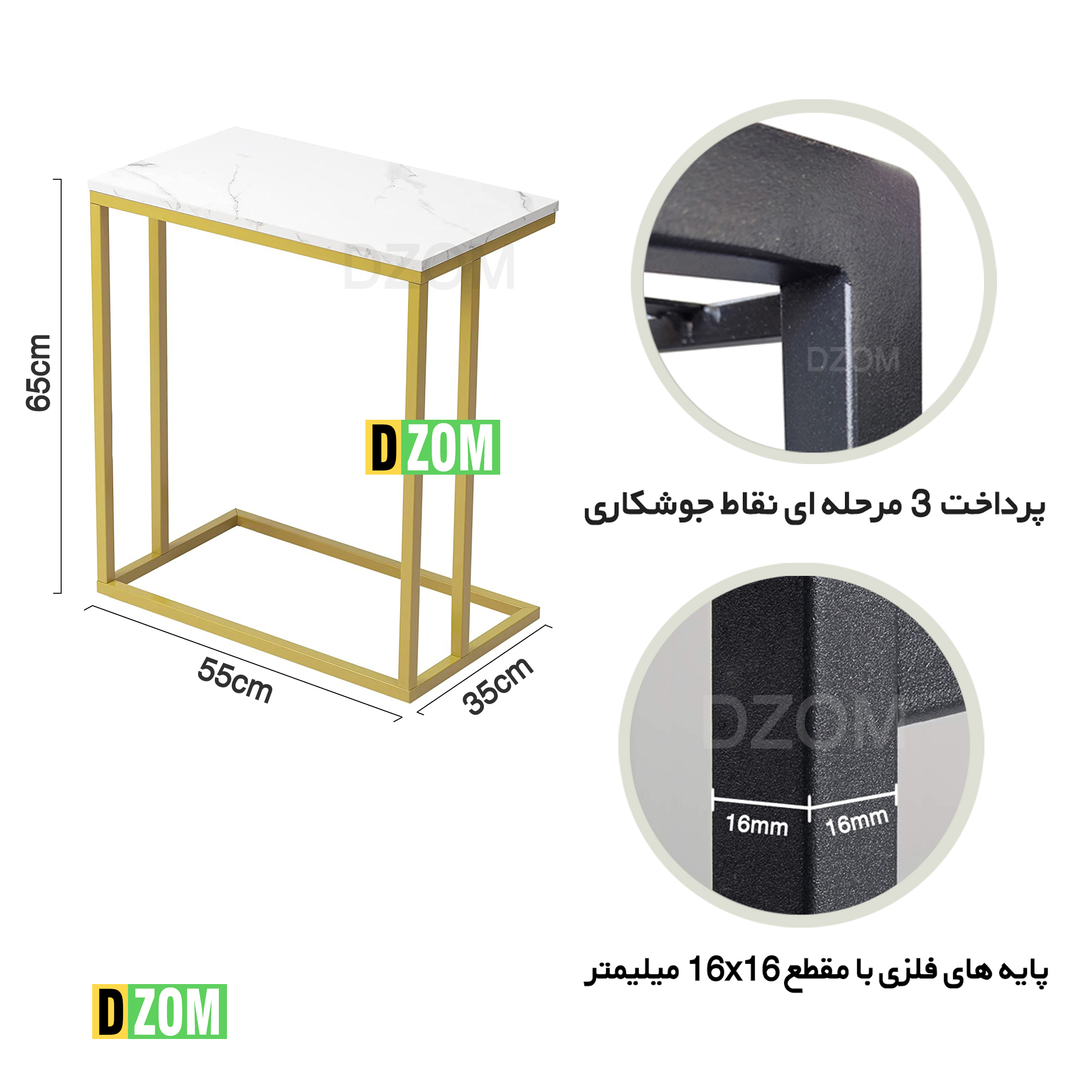 میز عسلی دیزم DZom مدل SI_P100_55_SW محصولی سبک، شیک و در عین حال جذاب و کارآمد از سری تولیدات دیزم میباشد. مشتری گرامی توجه نمایید محصولات برند دیزم (شماره ثبت 414013 اداره ثبت علائم تجاری) با کیفیت و بسته بندی اصلی تنها توسط فروشنده رسمی دیزم در دیجی کالا عرضه می گردد، لطفا از خرید کالای تقلبی از سایر فروشندگان خودداری فرمایید. برند دیزم هیچگونه نمایندگی فروش در بازارهای فیزیکی و آنلاین نداشته و محصولات خود را مستقیما از طریق سایت Dzom.ir یا شبکه های اجتماعی خود به مصرف کننده (End User) عرضه می نماید. این میز از پایه های فلزی با مقطع 16×16 میلیمتر و رنگ رویه الکترواستاتیک با ماندگاری و دوام بالا ساخته شده است. صفحه میز از جنس MDF درجه یک طرح سنگ به رنگ سفید می باشد. این محصول با طول 55cm، عرض 35cm و ارتفاع 65cm عرضه می شود. به این نکته توجه شود که تنوع رنگ انتخابی کالا تنها مربوط به رنگ پایه های فلزی میباشد و محصول به صورت کاملا مونتاژ شده و آماده استفاده برای مشتریان ارسال می گردد.