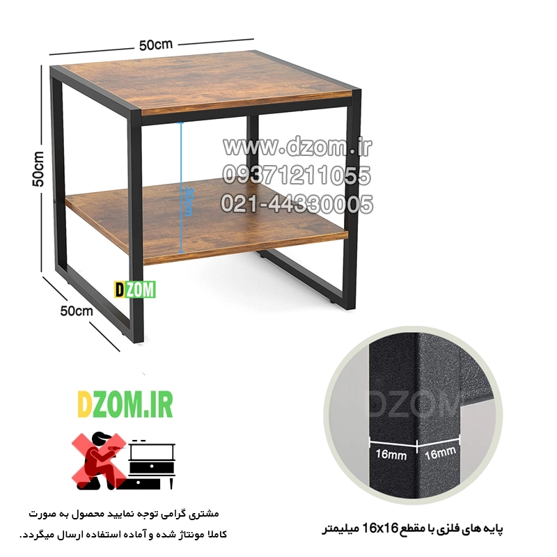 میز عسلی دیزم DZom مدل SI_Q100_50_BRN محصولی سبک، شیک و در عین حال جذاب و کارآمد از سری تولیدات دیزم میباشد.مشتری گرامی توجه نمایید برند دیزم (شماره ثبت 414013 اداره ثبت علائم تجاری) هیچگونه نمایندگی فروش در بازارهای فیزیکی و آنلاین نداشته و محصولات خود را با کیفیت و بسته بندی اصلی، مستقیما از طریق سایت Dzom.ir یا شبکه های اجتماعی خود به مصرف کننده (End User) عرضه می نماید. لطفا از خرید کالای تقلبی از سایر فروشندگان خودداری فرمایید. این میز از پایه های فلزی با مقطع 16×16 میلیمتر و رنگ رویه الکترواستاتیک با ماندگاری و دوام بالا ساخته شده است و دارای پایه های لاستیکی می باشد. صفحه میز از جنس MDF درجه یک برجسته طرح چوب به رنگ قهوه ای می باشد. این محصول با طول 50cm، عرض 50cm و ارتفاع 50cm عرضه می شود. به این نکته توجه شود که تنوع رنگ انتخابی کالا تنها مربوط به رنگ پایه های فلزی میباشد و محصول به صورت کاملا مونتاژ شده و آماده استفاده برای مشتریان ارسال می گردد.