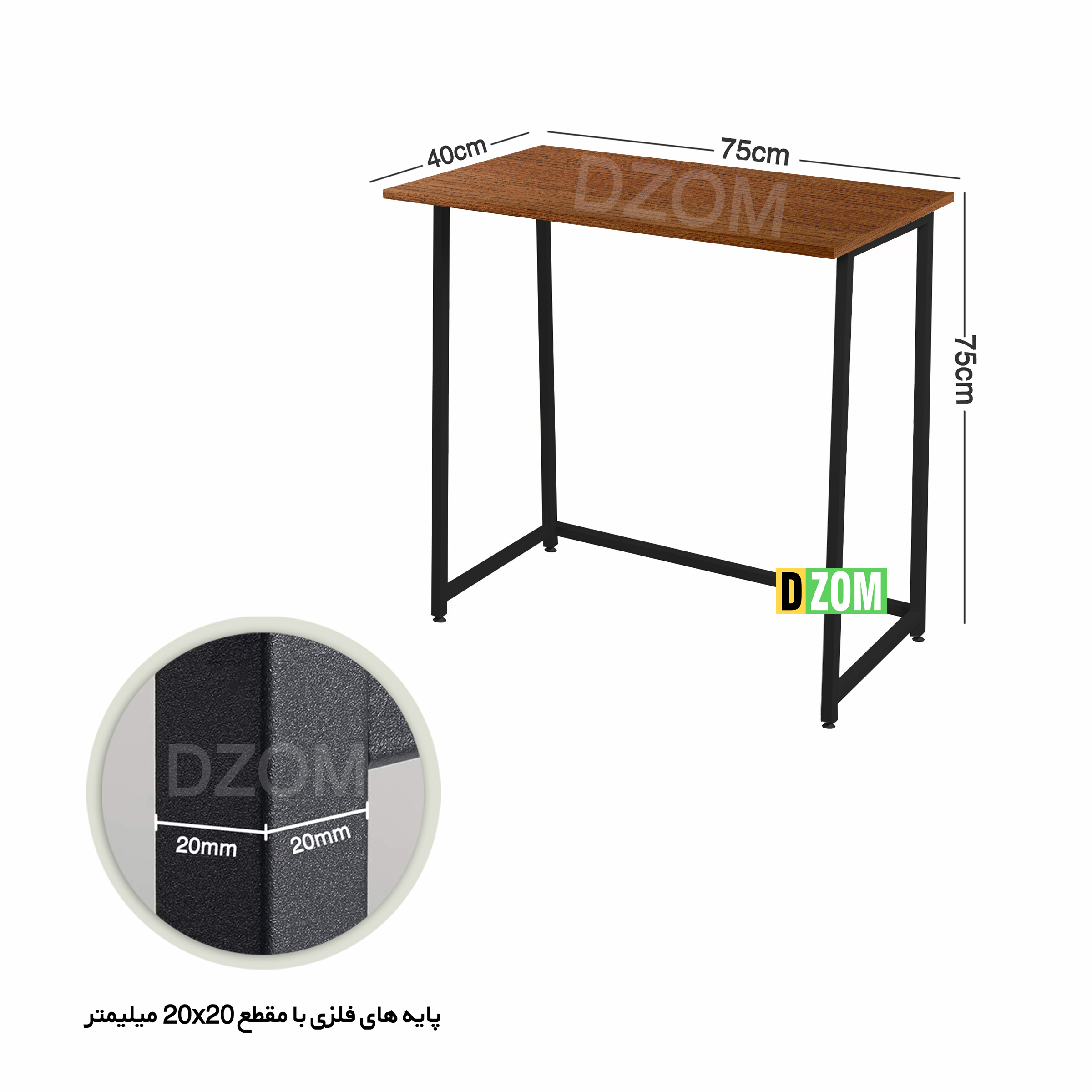 میز دیزم DZom مدل CD_J100_75_BRN محصولی سبک، شیک و در عین حال جذاب و کارآمد از سری تولیدات دیزم میباشد. مشتری گرامی توجه نمایید برند دیزم (شماره ثبت 414013 اداره ثبت علائم تجاری) هیچگونه نمایندگی فروش در بازارهای فیزیکی و آنلاین نداشته و محصولات خود را با کیفیت و بسته بندی اصلی، مستقیما از طریق سایت Dzom.ir یا شبکه های اجتماعی خود به مصرف کننده (End User) عرضه می نماید. لطفا از خرید کالای تقلبی از سایر فروشندگان خودداری فرمایید. این محصول از پایه های فلزی با مقطع 20×20 میلیمتر و رنگ رویه الکترواستاتیک با ماندگاری و دوام بالا ساخته شده است. همچنین پایه های پیچی، قابلیت تنظیم نسبت به سطح زمین را دارد تا بهترین تراز جهت جلوگیری از تکان خوردن را ایجاد نماید. صفحه محصول از جنس MDF درجه یک برجسته طرح چوب و به رنگ قهوه ای می باشد. این محصول با طول 75cm، عرض 40cm و ارتفاع 75cm عرضه می شود. به این نکته توجه شود که تنوع رنگ انتخابی کالا تنها مربوط به رنگ پایه های فلزی میباشد و محصول به صورت کاملا مونتاژ شده و آماده استفاده برای مشتریان ارسال می گردد.
