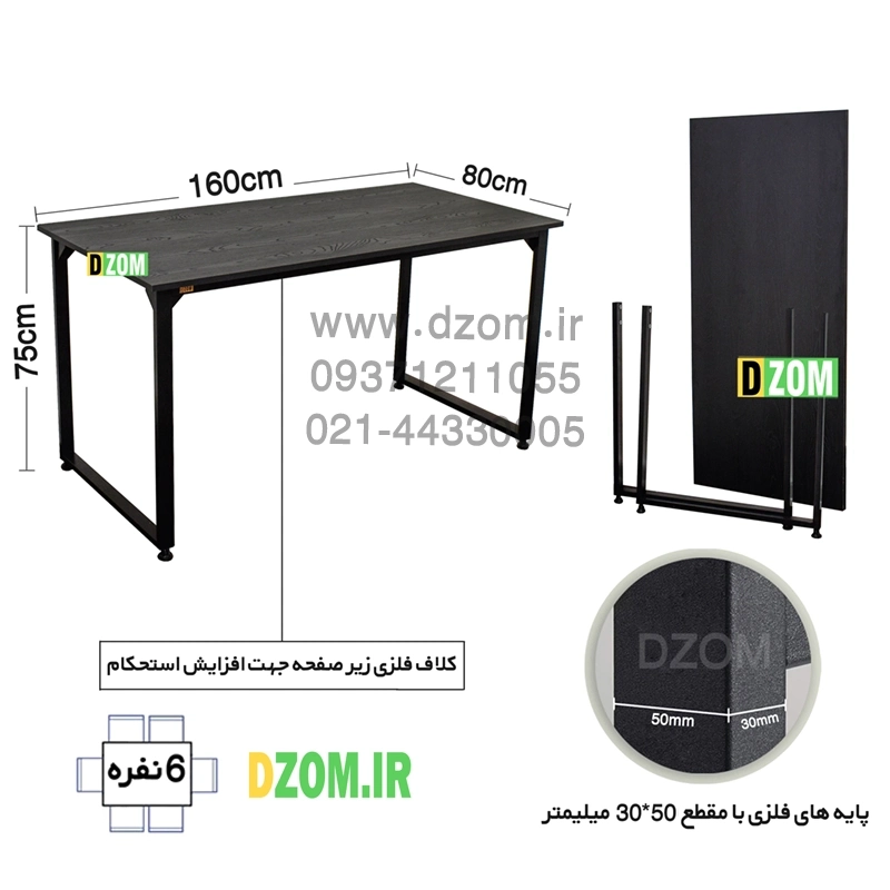 میز ناهار خوری دیزم DZom مدل مونتاژی LNC_asm_160×80_B محصولی مونتاژی، سبک، شیک و در عین حال جذاب و کارآمد از سری تولیدات دیزم میباشد. مشتری گرامی توجه نمایید برند دیزم (شماره ثبت 414013 اداره ثبت علائم تجاری) هیچگونه نمایندگی فروش در بازارهای فیزیکی و آنلاین نداشته و محصولات خود را با کیفیت و بسته بندی اصلی، مستقیما از طریق سایت Dzom.ir یا شبکه های اجتماعی خود به مصرف کننده (End User) عرضه می نماید. لطفا از خرید کالای تقلبی از سایر فروشندگان خودداری فرمایید. این محصول بصورت سلف اسمبل (مونتاژی) تولید شده است. این میز حمل و نقل آسان و هزینه حمل مقرون به صرفه ای دارد. این میز از پایه های فلزی با مقطع 50×30 میلیمتر و رنگ رویه الکترواستاتیک با ماندگاری و دوام بالا ساخته شده است. همچنین پایه های پیچی، قابلیت تنظیم نسبت به سطح زمین را دارد تا بهترین تراز جهت جلوگیری از تکان خوردن را ایجاد نماید. صفحه میز از جنس MDF درجه یک برجسته طرح چوب به رنگ مشکی می باشد. این محصول با طول 160cm، عرض 80cm و ارتفاع 75cm عرضه می شود. به این نکته توجه شود که تنوع رنگ انتخابی کالا تنها مربوط به رنگ پایه های فلزی میباشد.