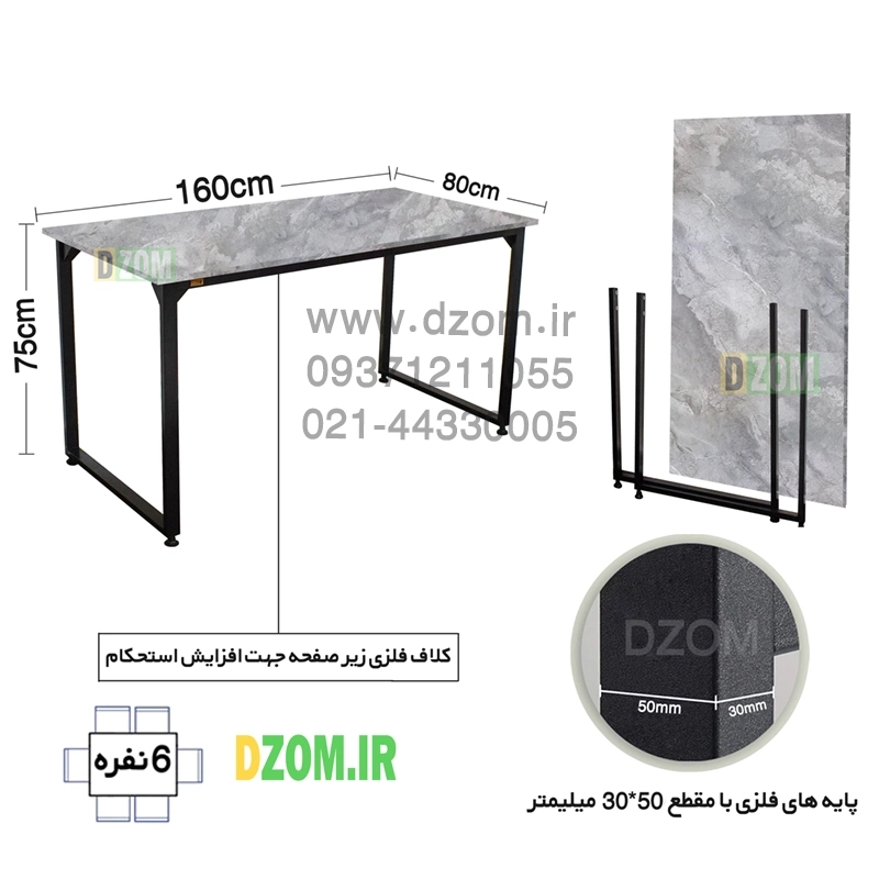 میز ناهار خوری دیزم DZom مدل مونتاژی LNC_asm_160×80_GR محصولی مونتاژی، سبک، شیک و در عین حال جذاب و کارآمد از سری تولیدات دیزم میباشد. مشتری گرامی توجه نمایید برند دیزم (شماره ثبت 414013 اداره ثبت علائم تجاری) هیچگونه نمایندگی فروش در بازارهای فیزیکی و آنلاین نداشته و محصولات خود را با کیفیت و بسته بندی اصلی، مستقیما از طریق سایت Dzom.ir یا شبکه های اجتماعی خود به مصرف کننده (End User) عرضه می نماید. لطفا از خرید کالای تقلبی از سایر فروشندگان خودداری فرمایید. این محصول بصورت سلف اسمبل (مونتاژی) تولید شده است. این میز حمل و نقل آسان و هزینه حمل مقرون به صرفه ای دارد. این میز از پایه های فلزی با مقطع 50×30 میلیمتر و رنگ رویه الکترواستاتیک با ماندگاری و دوام بالا ساخته شده است. همچنین پایه های پیچی، قابلیت تنظیم نسبت به سطح زمین را دارد تا بهترین تراز جهت جلوگیری از تکان خوردن را ایجاد نماید. صفحه میز از جنس MDF درجه یک به رنگ طوسی می باشد. این محصول با طول 160cm، عرض 80cm و ارتفاع 75cm عرضه می شود. به این نکته توجه شود که تنوع رنگ انتخابی کالا تنها مربوط به رنگ پایه های فلزی میباشد.