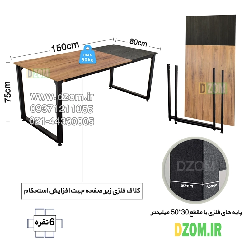میز ناهارخوری دیزم DZom مدل مونتاژی LNC_asm_150×80_Di_BALIGHT محصولی مونتاژی، سبک، شیک و در عین حال جذاب و کارآمد از سری تولیدات دیزم میباشد. این محصول بصورت سلف اسمبل (مونتاژی) تولید شده است.مشتری گرامی توجه نمایید برند دیزم (شماره ثبت 414013 اداره ثبت علائم تجاری) هیچگونه نمایندگی فروش در بازارهای فیزیکی و آنلاین نداشته و محصولات خود را با کیفیت و بسته بندی اصلی، مستقیما از طریق سایت Dzom.ir یا شبکه های اجتماعی خود به مصرف کننده (End User) عرضه می نماید. لطفا از خرید کالای تقلبی از سایر فروشندگان خودداری فرمایید. این میز حمل و نقل آسان و هزینه حمل مقرون به صرفه ای دارد. این میز از پایه های فلزی با مقطع 50×30 میلیمتر و رنگ رویه الکترواستاتیک با ماندگاری و دوام بالا ساخته شده است. همچنین پایه های پیچی، قابلیت تنظیم نسبت به سطح زمین را دارد تا بهترین تراز جهت جلوگیری از تکان خوردن را ایجاد نماید. صفحه میز از جنس MDF درجه یک برجسته طرح چوب و ترکیبی از دو رنگ مشکی و قهوه ای روشن می باشد. این محصول با طول 150cm، عرض 80cm و ارتفاع 75cm عرضه می شود. به این نکته توجه شود که تنوع رنگ انتخابی کالا تنها مربوط به رنگ پایه های فلزی میباشد.