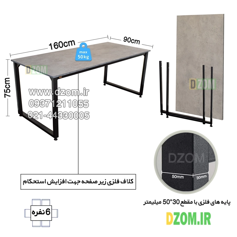 میز ناهارخوری دیزم DZom مدل مونتاژی LNC_asm_160×90_GR محصولی مونتاژی، سبک، شیک و در عین حال جذاب و کارآمد از سری تولیدات دیزم میباشد. مشتری گرامی توجه نمایید برند دیزم (شماره ثبت 414013 اداره ثبت علائم تجاری) هیچگونه نمایندگی فروش در بازارهای فیزیکی و آنلاین نداشته و محصولات خود را با کیفیت و بسته بندی اصلی، مستقیما از طریق سایت Dzom.ir یا شبکه های اجتماعی خود به مصرف کننده (End User) عرضه می نماید. لطفا از خرید کالای تقلبی از سایر فروشندگان خودداری فرمایید. این محصول بصورت سلف اسمبل (مونتاژی) تولید شده است. این میز حمل و نقل آسان و هزینه حمل مقرون به صرفه ای دارد. این میز از پایه های فلزی با مقطع 50×30 میلیمتر و رنگ رویه الکترواستاتیک با ماندگاری و دوام بالا ساخته شده است. همچنین پایه های پیچی، قابلیت تنظیم نسبت به سطح زمین را دارد تا بهترین تراز جهت جلوگیری از تکان خوردن را ایجاد نماید. صفحه میز از جنس MDF درجه یک به رنگ طوسی می باشد. این محصول با طول 160cm، عرض 90cm و ارتفاع 75cm عرضه می شود. به این نکته توجه شود که تنوع رنگ انتخابی کالا تنها مربوط به رنگ پایه های فلزی میباشد.