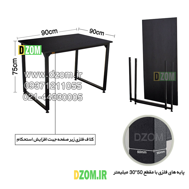 میز ناهارخوری دیزم DZom مدل مونتاژی LNC_asm_90×90_B محصولی مونتاژی، سبک، شیک و در عین حال جذاب و کارآمد از سری تولیدات دیزم میباشد. مشتری گرامی توجه نمایید برند دیزم (شماره ثبت 414013 اداره ثبت علائم تجاری) هیچگونه نمایندگی فروش در بازارهای فیزیکی و آنلاین نداشته و محصولات خود را با کیفیت و بسته بندی اصلی، مستقیما از طریق سایت Dzom.ir یا شبکه های اجتماعی خود به مصرف کننده (End User) عرضه می نماید. لطفا از خرید کالای تقلبی از سایر فروشندگان خودداری فرمایید. این محصول بصورت سلف اسمبل (مونتاژی) تولید شده است. این میز حمل و نقل آسان و هزینه حمل مقرون به صرفه ای دارد. این میز از پایه های فلزی با مقطع 50×30 میلیمتر و رنگ رویه الکترواستاتیک با ماندگاری و دوام بالا ساخته شده است. همچنین پایه های پیچی، قابلیت تنظیم نسبت به سطح زمین را دارد تا بهترین تراز جهت جلوگیری از تکان خوردن را ایجاد نماید. صفحه میز از جنس MDF درجه یک برجسته طرح چوب به رنگ مشکی می باشد. این محصول با طول 90cm، عرض 90cm و ارتفاع 75cm عرضه می شود. به این نکته توجه شود که تنوع رنگ انتخابی کالا تنها مربوط به رنگ پایه های فلزی میباشد.