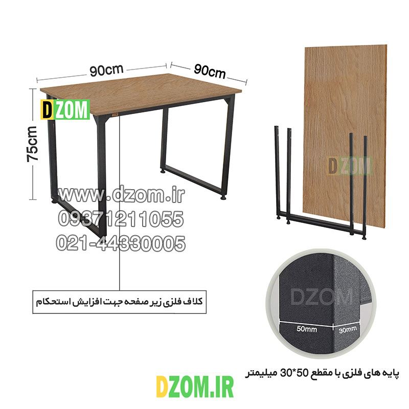 میز ناهارخوری دیزم DZom مدل مونتاژی LNC_asm_90×90_LIGHT محصولی مونتاژی، سبک، شیک و در عین حال جذاب و کارآمد از سری تولیدات دیزم میباشد.مشتری گرامی توجه نمایید برند دیزم (شماره ثبت 414013 اداره ثبت علائم تجاری) هیچگونه نمایندگی فروش در بازارهای فیزیکی و آنلاین نداشته و محصولات خود را با کیفیت و بسته بندی اصلی، مستقیما از طریق سایت Dzom.ir یا شبکه های اجتماعی خود به مصرف کننده (End User) عرضه می نماید. لطفا از خرید کالای تقلبی از سایر فروشندگان خودداری فرمایید. این محصول بصورت سلف اسمبل (مونتاژی) تولید شده است. این میز حمل و نقل آسان و هزینه حمل مقرون به صرفه ای دارد. این میز از پایه های فلزی با مقطع 50×30 میلیمتر و رنگ رویه الکترواستاتیک با ماندگاری و دوام بالا ساخته شده است. همچنین پایه های پیچی، قابلیت تنظیم نسبت به سطح زمین را دارد تا بهترین تراز جهت جلوگیری از تکان خوردن را ایجاد نماید. صفحه میز از جنس MDF درجه یک برجسته طرح چوب به رنگ قهوه ای روشن می باشد. این محصول با طول 90cm، عرض 90cm و ارتفاع 75cm عرضه می شود. به این نکته توجه شود که تنوع رنگ انتخابی کالا تنها مربوط به رنگ پایه های فلزی میباشد.