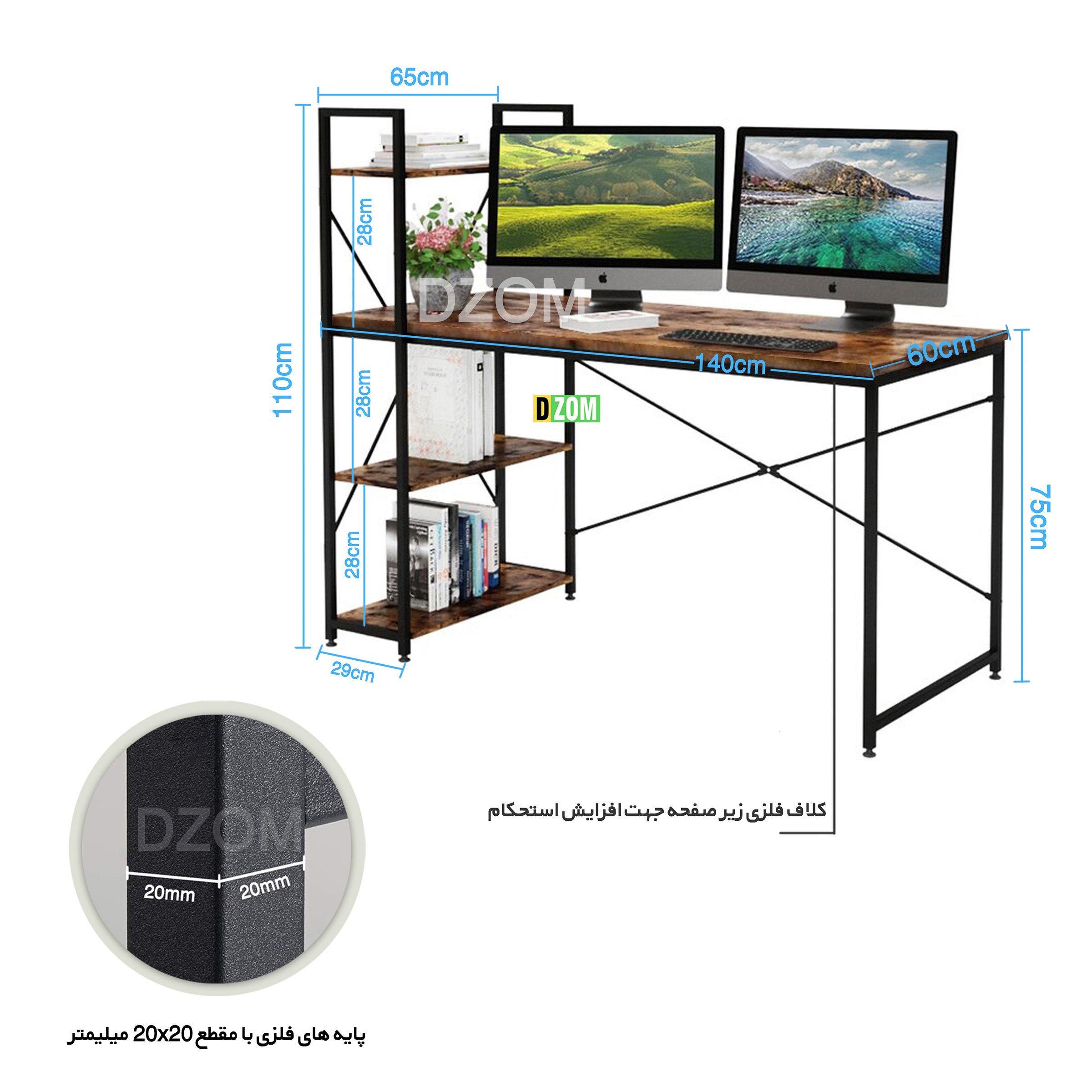میز دیزم DZom مدل CD-1-140-2ONE محصولی سبک، شیک و در عین حال جذاب و کارآمد از سری تولیدات دیزم میباشد. مشتری گرامی توجه نمایید محصولات برند دیزم (شماره ثبت 414013 اداره ثبت علائم تجاری) با کیفیت و بسته بندی اصلی تنها توسط فروشنده رسمی دیزم در دیجی کالا عرضه می گردد، لطفا از خرید کالای تقلبی از سایر فروشندگان خودداری فرمایید. برند دیزم هیچگونه نمایندگی فروش در بازارهای فیزیکی و آنلاین نداشته و محصولات خود را مستقیما از طریق سایت Dzom.ir یا شبکه های اجتماعی خود به مصرف کننده (End User) عرضه می نماید. این محصول از پایه های فلزی با مقطع 20×20 میلیمتر و رنگ رویه الکترواستاتیک با ماندگاری و دوام بالا ساخته شده است. همچنین پایه های پیچی، قابلیت تنظیم نسبت به سطح زمین را دارد تا بهترین تراز جهت جلوگیری از تکان خوردن را ایجاد نماید. صفحه محصول از جنس MDF درجه یک برجسته طرح چوب و به رنگ قهوه ای می باشد. این محصول با طول 140cm، عرض 65cm و ارتفاع 110cm عرضه می شود. (لطفا دقت شود که عرض کل 65 است و عرض خود میز 60 می باشد). به این نکته توجه شود که تنوع رنگ انتخابی کالا تنها مربوط به رنگ پایه های فلزی میباشد و محصول به صورت کاملا مونتاژ شده و آماده استفاده برای مشتریان ارسال می گردد.