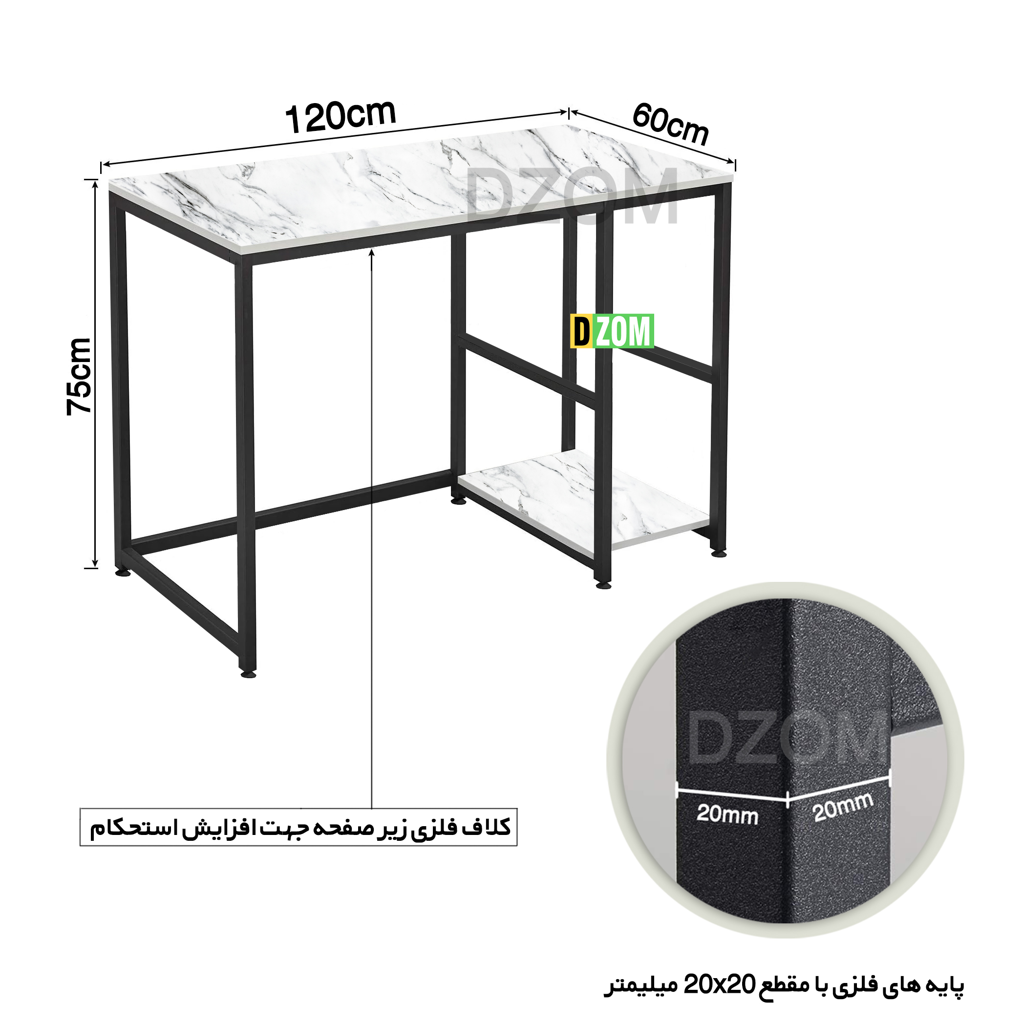 میز کامپیوتر دیزم DZom مدل CD_31U47_120SW محصولی سبک، شیک و در عین حال جذاب و کارآمد از سری تولیدات دیزم میباشد. مشتری گرامی توجه نمایید محصولات برند دیزم (شماره ثبت 414013 اداره ثبت علائم تجاری) با کیفیت و بسته بندی اصلی تنها توسط فروشنده رسمی دیزم در دیجی کالا عرضه می گردد، لطفا از خرید کالای تقلبی از سایر فروشندگان خودداری فرمایید. برند دیزم هیچگونه نمایندگی فروش در بازارهای فیزیکی و آنلاین نداشته و محصولات خود را مستقیما از طریق سایت Dzom.ir یا شبکه های اجتماعی خود به مصرف کننده (End User) عرضه می نماید. این میز از پایه های فلزی با مقطع 20×20 میلیمتر و رنگ رویه الکترواستاتیک با ماندگاری و دوام بالا ساخته شده است. همچنین پایه های پیچی، قابلیت تنظیم نسبت به سطح زمین را دارد تا بهترین تراز جهت جلوگیری از تکان خوردن را ایجاد نماید. صفحه میز از جنس MDF درجه یک طرح سنگ به رنگ سفید می باشد. این محصول با طول 120cm، عرض 60cm و ارتفاع 75cm عرضه می شود. به این نکته توجه شود که تنوع رنگ انتخابی کالا تنها مربوط به رنگ پایه های فلزی میباشد و محصول به صورت کاملا مونتاژ شده و آماده استفاده برای مشتریان ارسال می گردد.