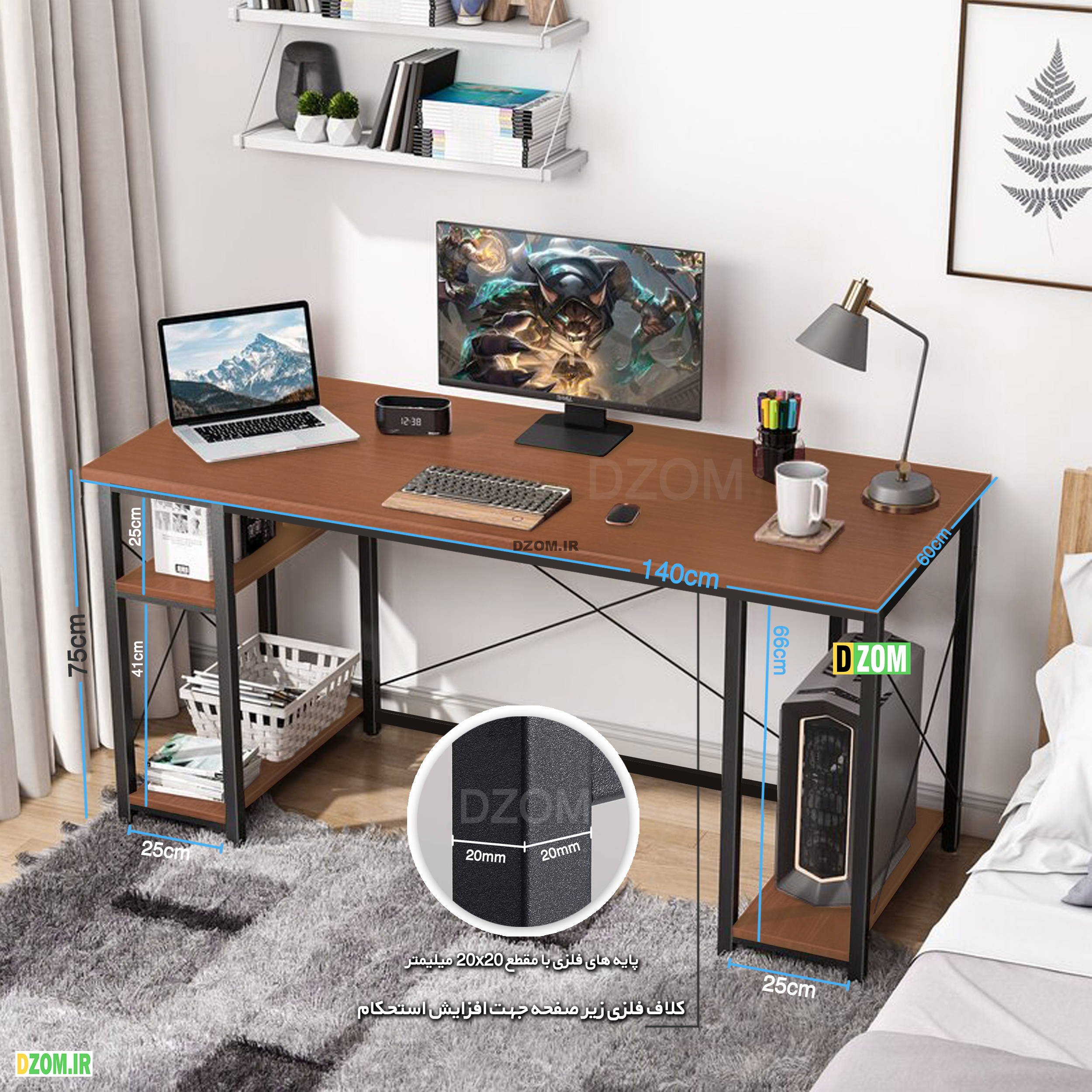 میز کامپیوتر دیزم DZom مدل TD-1-140-1ONE محصولی سبک، شیک و در عین حال جذاب و کارآمد از سری تولیدات دیزم میباشد. مشتری گرامی توجه نمایید محصولات برند دیزم (شماره ثبت 414013 اداره ثبت علائم تجاری) با کیفیت و بسته بندی اصلی تنها توسط فروشنده رسمی دیزم در دیجی کالا عرضه می گردد، لطفا از خرید کالای تقلبی از سایر فروشندگان خودداری فرمایید. برند دیزم هیچگونه نمایندگی فروش در بازارهای فیزیکی و آنلاین نداشته و محصولات خود را مستقیما از طریق سایت Dzom.ir یا شبکه های اجتماعی خود به مصرف کننده (End User) عرضه می نماید. این محصول از پایه های فلزی با مقطع 20×20 میلیمتر و رنگ رویه الکترواستاتیک با ماندگاری و دوام بالا ساخته شده است. همچنین پایه های پیچی، قابلیت تنظیم نسبت به سطح زمین را دارد تا بهترین تراز جهت جلوگیری از تکان خوردن را ایجاد نماید. صفحه میز از جنس MDF درجه یک برجسته طرح چوب به رنگ قهوه ای می باشد. این محصول با طول 140cm، عرض 60cm و ارتفاع 75cm عرضه می شود. به این نکته توجه شود که تنوع رنگ انتخابی کالا تنها مربوط به رنگ پایه های فلزی میباشد و محصول به صورت کاملا مونتاژ شده و آماده استفاده برای مشتریان ارسال می گردد.