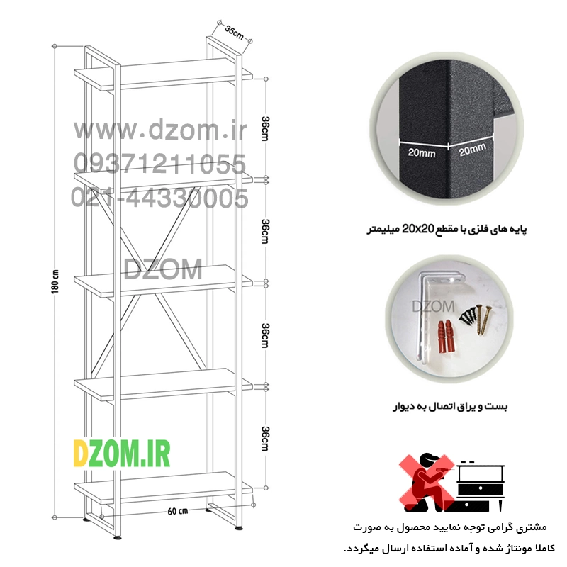 کتابخانه دیزم DZom مدلLIB-08U77-60W محصولی سبک، شیک و در عین حال جذاب و کارآمد از سری تولیدات دیزم میباشد. مشتری گرامی توجه نمایید برند دیزم (شماره ثبت 414013 اداره ثبت علائم تجاری) هیچگونه نمایندگی فروش در بازارهای فیزیکی و آنلاین نداشته و محصولات خود را با کیفیت و بسته بندی اصلی، مستقیما از طریق سایت Dzom.ir یا شبکه های اجتماعی خود به مصرف کننده (End User) عرضه می نماید. لطفا از خرید کالای تقلبی از سایر فروشندگان خودداری فرمایید. این محصول از پایه های فلزی با مقطع 20×20 میلیمتر و رنگ رویه الکترواستاتیک با ماندگاری و دوام بالا ساخته شده است. همچنین پایه های پیچی، قابلیت تنظیم نسبت به سطح زمین را دارد تا بهترین تراز جهت جلوگیری از تکان خوردن را ایجاد نماید. صفحه میز از جنس MDF درجه یک برجسته طرح چوب به رنگ سفید می باشد. این محصول با طول 60cm، عرض 35cm و ارتفاع 180cm عرضه می شود. به این نکته توجه شود که تنوع رنگ انتخابی کالا تنها مربوط به رنگ پایه های فلزی میباشد و محصول به صورت کاملا مونتاژ شده و آماده استفاده برای مشتریان ارسال می گردد. توصیه میشود جهت حفظ ایمنی و ثبات بیشتر، محصول در یک یا دو نقطه به دیوار پیچ گردد.(یراق اتصال داخل بسته بندی موجود است).