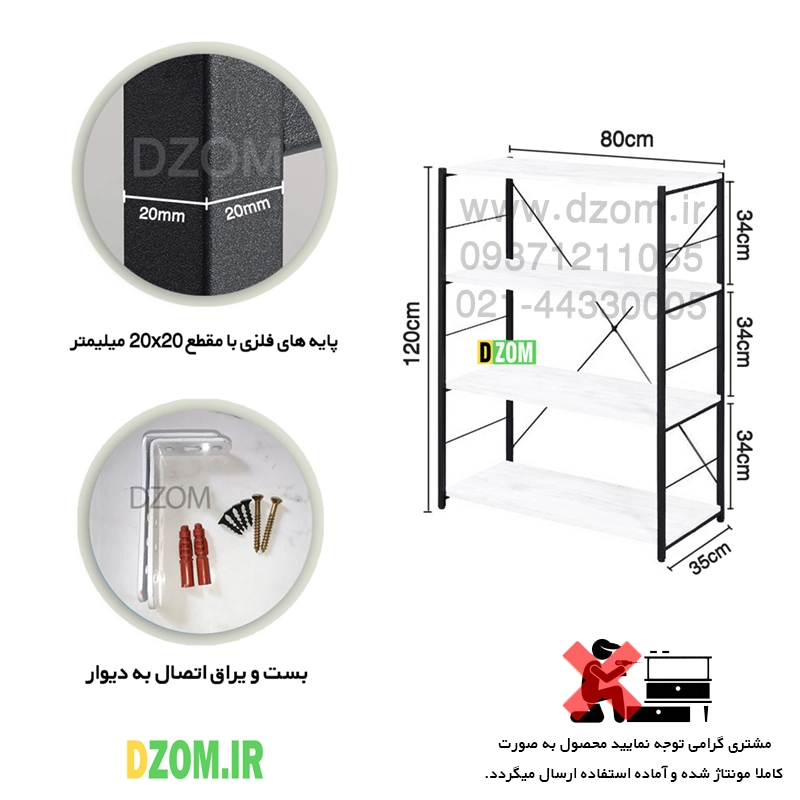 کتابخانه دیزم DZom مدل LIB-34J01-80W محصولی سبک، شیک و در عین حال جذاب و کارآمد از سری تولیدات دیزم میباشد. مشتری گرامی توجه نمایید برند دیزم (شماره ثبت 414013 اداره ثبت علائم تجاری) هیچگونه نمایندگی فروش در بازارهای فیزیکی و آنلاین نداشته و محصولات خود را با کیفیت و بسته بندی اصلی، مستقیما از طریق سایت Dzom.ir یا شبکه های اجتماعی خود به مصرف کننده (End User) عرضه می نماید. لطفا از خرید کالای تقلبی از سایر فروشندگان خودداری فرمایید. این محصول از پایه های فلزی با مقطع 20×20 میلیمتر و رنگ رویه الکترواستاتیک با ماندگاری و دوام بالا ساخته شده است. همچنین پایه های پیچی، قابلیت تنظیم نسبت به سطح زمین را دارد تا بهترین تراز جهت جلوگیری از تکان خوردن را ایجاد نماید. صفحه محصول از جنس MDF درجه یک برجسته طرح چوب و به رنگ سفید می باشد. این محصول با طول 80cm، عرض 35cm و ارتفاع 120cm عرضه می شود. به این نکته توجه شود که تنوع رنگ انتخابی کالا تنها مربوط به رنگ پایه های فلزی میباشد و محصول به صورت کاملا مونتاژ شده و آماده استفاده برای مشتریان ارسال می گردد. توصیه میشود جهت حفظ ایمنی و ثبات بیشتر، محصول در یک یا دو نقطه به دیوار پیچ گرد.(یراق اتصال داخل بسته بندی موجود است).