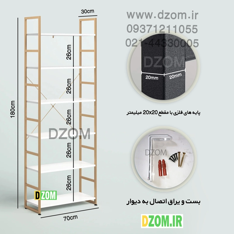 کتابخانه دیزم DZom مدل LIB-36C07-70W محصولی سبک، شیک و در عین حال جذاب و کارآمد از سری تولیدات دیزم میباشد. مشتری گرامی توجه نمایید برند دیزم (شماره ثبت 414013 اداره ثبت علائم تجاری) هیچگونه نمایندگی فروش در بازارهای فیزیکی و آنلاین نداشته و محصولات خود را با کیفیت و بسته بندی اصلی، مستقیما از طریق سایت Dzom.ir یا شبکه های اجتماعی خود به مصرف کننده (End User) عرضه می نماید. لطفا از خرید کالای تقلبی از سایر فروشندگان خودداری فرمایید. این محصول از پایه های فلزی با مقطع 20×20 میلیمتر و رنگ رویه الکترواستاتیک با ماندگاری و دوام بالا ساخته شده است. همچنین پایه های پیچی، قابلیت تنظیم نسبت به سطح زمین را دارد تا بهترین تراز جهت جلوگیری از تکان خوردن را ایجاد نماید. صفحه میز از جنس MDF درجه یک برجسته طرح چوب به رنگ سفید می باشد. این محصول با طول 70cm، عرض 30cm و ارتفاع 180cm عرضه می شود. به این نکته توجه شود که تنوع رنگ انتخابی کالا تنها مربوط به رنگ پایه های فلزی میباشد و محصول به صورت کاملا مونتاژ شده و آماده استفاده برای مشتریان ارسال می گردد. توصیه میشود جهت حفظ ایمنی و ثبات بیشتر، محصول در یک یا دو نقطه به دیوار پیچ گرد.(یراق اتصال داخل بسته بندی موجود است).