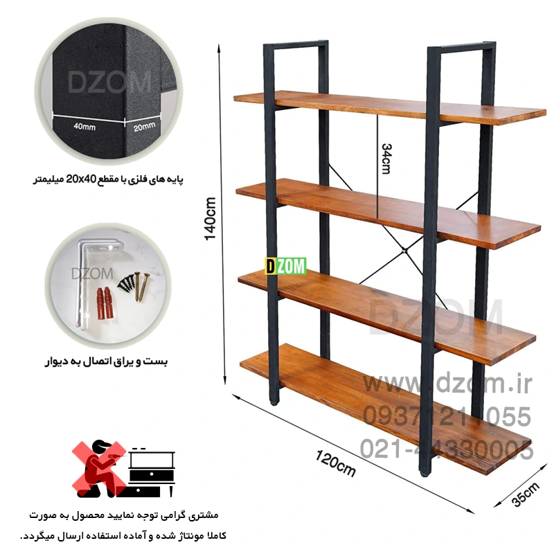 کتابخانه دیزم DZom مدل LIB-43Z91-120BRN محصولی سبک، شیک و در عین حال جذاب و کارآمد از سری تولیدات دیزم میباشد. مشتری گرامی توجه نمایید برند دیزم (شماره ثبت 414013 اداره ثبت علائم تجاری) هیچگونه نمایندگی فروش در بازارهای فیزیکی و آنلاین نداشته و محصولات خود را با کیفیت و بسته بندی اصلی، مستقیما از طریق سایت Dzom.ir یا شبکه های اجتماعی خود به مصرف کننده (End User) عرضه می نماید. لطفا از خرید کالای تقلبی از سایر فروشندگان خودداری فرمایید. این محصول از پایه های فلزی با مقطع 20×40 میلیمتر و رنگ رویه الکترواستاتیک با ماندگاری و دوام بالا ساخته شده است. همچنین پایه های پیچی، قابلیت تنظیم نسبت به سطح زمین را دارد تا بهترین تراز جهت جلوگیری از تکان خوردن را ایجاد نماید. صفحه محصول از جنس MDF درجه یک برجسته طرح چوب به رنگ قهوه ای می باشد. این محصول با طول 120cm، عرض 35cm و ارتفاع 140cmعرضه می شود. به این نکته توجه شود که تنوع رنگ انتخابی کالا تنها مربوط به رنگ پایه های فلزی میباشد و محصول به صورت کاملا مونتاژ شده و آماده استفاده برای مشتریان ارسال می گردد. توصیه میشود جهت حفظ ایمنی و ثبات بیشتر، محصول در یک یا دو نقطه به دیوار پیچ گردد.(یراق اتصال داخل بسته بندی موجود است).