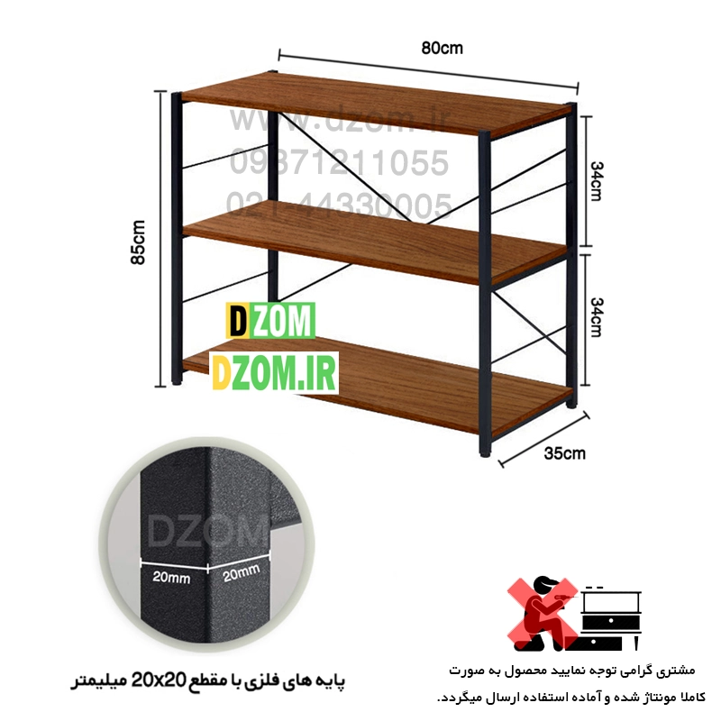 کتابخانه دیزم DZom مدل LIB-77K12-80BRN محصولی سبک، شیک و در عین حال جذاب و کارآمد از سری تولیدات دیزم میباشد. مشتری گرامی توجه نمایید برند دیزم (شماره ثبت 414013 اداره ثبت علائم تجاری) هیچگونه نمایندگی فروش در بازارهای فیزیکی و آنلاین نداشته و محصولات خود را با کیفیت و بسته بندی اصلی، مستقیما از طریق سایت Dzom.ir یا شبکه های اجتماعی خود به مصرف کننده (End User) عرضه می نماید. لطفا از خرید کالای تقلبی از سایر فروشندگان خودداری فرمایید. این محصول از پایه های فلزی با مقطع 20×20 میلیمتر و رنگ رویه الکترواستاتیک با ماندگاری و دوام بالا ساخته شده است. همچنین پایه های پیچی، قابلیت تنظیم نسبت به سطح زمین را دارد تا بهترین تراز جهت جلوگیری از تکان خوردن را ایجاد نماید. صفحه محصول از جنس MDF درجه یک برجسته طرح چوب و به رنگ قهوه ای می باشد. این محصول با طول 80cm، عرض 35cm و ارتفاع 85cm عرضه می شود. به این نکته توجه شود که تنوع رنگ انتخابی کالا تنها مربوط به رنگ پایه های فلزی میباشد و محصول به صورت کاملا مونتاژ شده و آماده استفاده برای مشتریان ارسال می گردد.