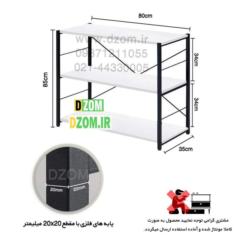 کتابخانه دیزم DZom مدل LIB-77K12-80W محصولی سبک، شیک و در عین حال جذاب و کارآمد از سری تولیدات دیزم میباشد. مشتری گرامی توجه نمایید برند دیزم (شماره ثبت 414013 اداره ثبت علائم تجاری) هیچگونه نمایندگی فروش در بازارهای فیزیکی و آنلاین نداشته و محصولات خود را با کیفیت و بسته بندی اصلی، مستقیما از طریق سایت Dzom.ir یا شبکه های اجتماعی خود به مصرف کننده (End User) عرضه می نماید. لطفا از خرید کالای تقلبی از سایر فروشندگان خودداری فرمایید. این محصول از پایه های فلزی با مقطع 20×20 میلیمتر و رنگ رویه الکترواستاتیک با ماندگاری و دوام بالا ساخته شده است. همچنین پایه های پیچی، قابلیت تنظیم نسبت به سطح زمین را دارد تا بهترین تراز جهت جلوگیری از تکان خوردن را ایجاد نماید. صفحه محصول از جنس MDF درجه یک برجسته طرح چوب و به رنگ سفید می باشد. این محصول با طول 80cm، عرض 35cm و ارتفاع 85cm عرضه می شود. به این نکته توجه شود که تنوع رنگ انتخابی کالا تنها مربوط به رنگ پایه های فلزی میباشد و محصول به صورت کاملا مونتاژ شده و آماده استفاده برای مشتریان ارسال می گردد.