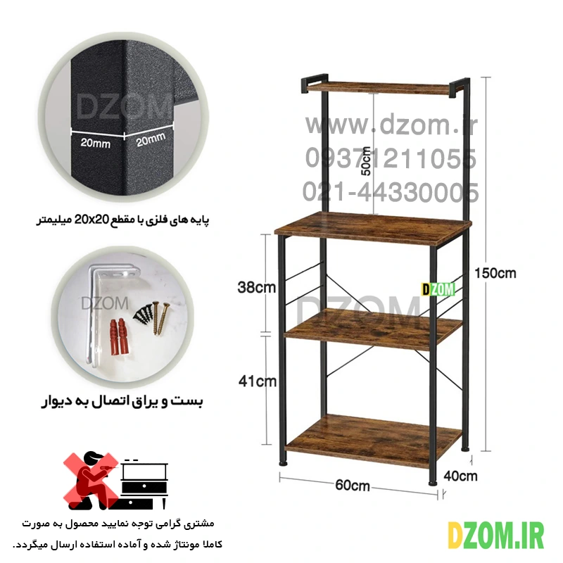 استند دیزم DZom مدل LIB_F100_60_BRN محصولی سبک، شیک و در عین حال جذاب و کارآمد از سری تولیدات دیزم میباشد. مشتری گرامی توجه نمایید برند دیزم (شماره ثبت 414013 اداره ثبت علائم تجاری) هیچگونه نمایندگی فروش در بازارهای فیزیکی و آنلاین نداشته و محصولات خود را با کیفیت و بسته بندی اصلی، مستقیما از طریق سایت Dzom.ir یا شبکه های اجتماعی خود به مصرف کننده (End User) عرضه می نماید. لطفا از خرید کالای تقلبی از سایر فروشندگان خودداری فرمایید. این محصول از پایه های فلزی با مقطع 20×20 میلیمتر و رنگ رویه الکترواستاتیک با ماندگاری و دوام بالا ساخته شده است. همچنین پایه های پیچی، قابلیت تنظیم نسبت به سطح زمین را دارد تا بهترین تراز جهت جلوگیری از تکان خوردن را ایجاد نماید. صفحه میز از جنس MDF درجه یک برجسته طرح چوب به رنگ قهوه ای می باشد. این محصول با طول 60cm، عرض 40cm و ارتفاع 150cm عرضه می شود. به این نکته توجه شود که تنوع رنگ انتخابی کالا تنها مربوط به رنگ پایه های فلزی میباشد و محصول به صورت کاملا مونتاژ شده و آماده استفاده برای مشتریان ارسال می گردد. توصیه میشود جهت حفظ ایمنی و ثبات بیشتر، محصول در یک یا دو نقطه به دیوار پیچ گرد.(یراق اتصال داخل بسته بندی موجود است).