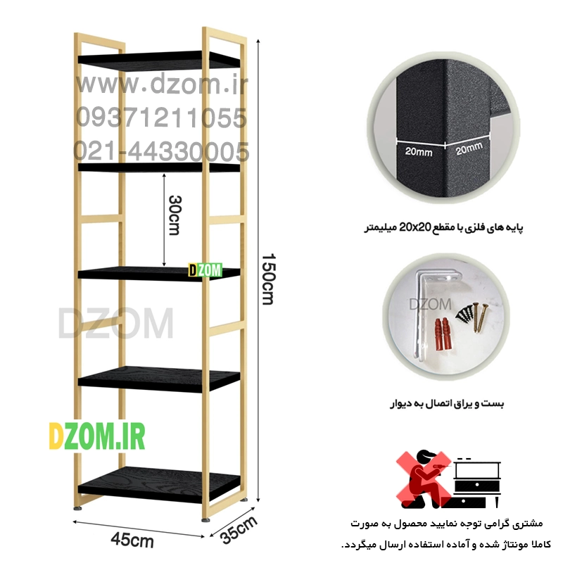 کتابخانه دیزم DZom مدل LIB_K100_45_B محصولی سبک، شیک و در عین حال جذاب و کارآمد از سری تولیدات دیزم میباشد. مشتری گرامی توجه نمایید برند دیزم (شماره ثبت 414013 اداره ثبت علائم تجاری) هیچگونه نمایندگی فروش در بازارهای فیزیکی و آنلاین نداشته و محصولات خود را با کیفیت و بسته بندی اصلی، مستقیما از طریق سایت Dzom.ir یا شبکه های اجتماعی خود به مصرف کننده (End User) عرضه می نماید. لطفا از خرید کالای تقلبی از سایر فروشندگان خودداری فرمایید. این محصول از پایه های فلزی با مقطع 20×20 میلیمتر و رنگ رویه الکترواستاتیک با ماندگاری و دوام بالا ساخته شده است. همچنین پایه های پیچی، قابلیت تنظیم نسبت به سطح زمین را دارد تا بهترین تراز جهت جلوگیری از تکان خوردن را ایجاد نماید. صفحه محصول از جنس MDF درجه یک برجسته طرح چوب و به رنگ مشکی می باشد. این محصول با طول 45cm، عرض 35cm و ارتفاع 150cm عرضه می شود. به این نکته توجه شود که تنوع رنگ انتخابی کالا تنها مربوط به رنگ پایه های فلزی میباشد و محصول به صورت کاملا مونتاژ شده و آماده استفاده برای مشتریان ارسال می گردد. توصیه میشود جهت حفظ ایمنی و ثبات بیشتر، محصول در یک یا دو نقطه به دیوار پیچ گرد.(یراق اتصال داخل بسته بندی موجود است).