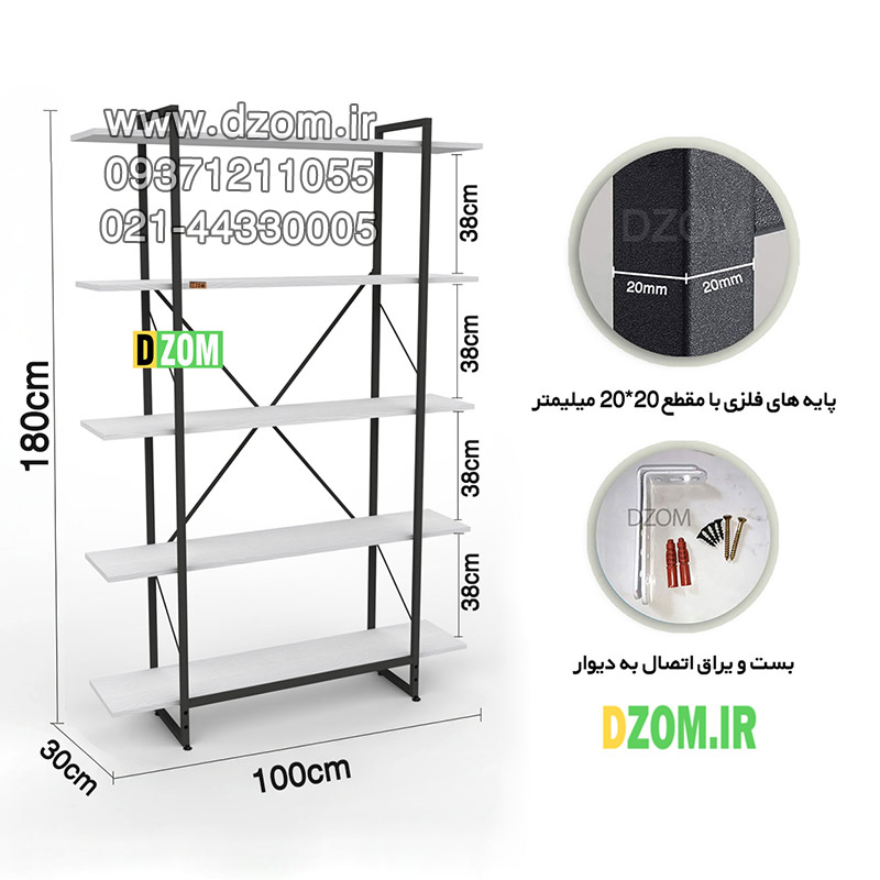 کتابخانه پنج طبقه دیزم DZom مدل مونتاژی LIB_100×180_W محصولی مونتاژی، سبک، شیک و در عین حال جذاب و کارآمد از سری تولیدات دیزم میباشد. مشتری گرامی توجه نمایید برند دیزم (شماره ثبت 414013 اداره ثبت علائم تجاری) هیچگونه نمایندگی فروش در بازارهای فیزیکی و آنلاین نداشته و محصولات خود را با کیفیت و بسته بندی اصلی، مستقیما از طریق سایت Dzom.ir یا شبکه های اجتماعی خود به مصرف کننده (End User) عرضه می نماید. لطفا از خرید کالای تقلبی از سایر فروشندگان خودداری فرمایید. این محصول بصورت سلف اسمبل (مونتاژی) تولید شده است. این کتابخانه حمل و نقل آسان و هزینه حمل مقرون به صرفه ای دارد. از پایه های فلزی با مقطع 20×20 میلیمتر و رنگ رویه الکترواستاتیک با ماندگاری و دوام بالا ساخته شده است. همچنین پایه های پیچی، قابلیت تنظیم نسبت به سطح زمین را دارد تا بهترین تراز جهت جلوگیری از تکان خوردن را ایجاد نماید. صفحات کتابخانه از جنس MDF درجه یک برجسته طرح چوب به رنگ سفید می باشد. این محصول با طول 100cm، عرض 30cm و ارتفاع 180cm عرضه می شود. به این نکته توجه شود که تنوع رنگ انتخابی کالا تنها مربوط به رنگ پایه های فلزی میباشد. توصیه میشود جهت حفظ ایمنی و ثبات بیشتر، محصول در یک یا دو نقطه به دیوار پیچ گردد.(یراق اتصال داخل بسته بندی موجود است).