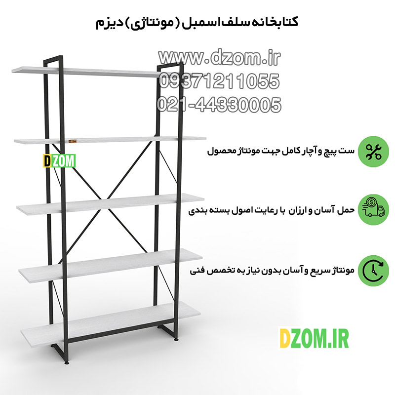 کتابخانه پنج طبقه دیزم DZom مدل مونتاژی LIB_120×180_W محصولی مونتاژی، سبک، شیک و در عین حال جذاب و کارآمد از سری تولیدات دیزم میباشد. مشتری گرامی توجه نمایید برند دیزم (شماره ثبت 414013 اداره ثبت علائم تجاری) هیچگونه نمایندگی فروش در بازارهای فیزیکی و آنلاین نداشته و محصولات خود را با کیفیت و بسته بندی اصلی، مستقیما از طریق سایت Dzom.ir یا شبکه های اجتماعی خود به مصرف کننده (End User) عرضه می نماید. لطفا از خرید کالای تقلبی از سایر فروشندگان خودداری فرمایید. این محصول بصورت سلف اسمبل (مونتاژی) تولید شده است. این کتابخانه حمل و نقل آسان و هزینه حمل مقرون به صرفه ای دارد. از پایه های فلزی با مقطع 20×20 میلیمتر و رنگ رویه الکترواستاتیک با ماندگاری و دوام بالا ساخته شده است. همچنین پایه های پیچی، قابلیت تنظیم نسبت به سطح زمین را دارد تا بهترین تراز جهت جلوگیری از تکان خوردن را ایجاد نماید. صفحات کتابخانه از جنس MDF درجه یک برجسته طرح چوب به رنگ سفید می باشد. این محصول با طول 120cm، عرض 30cm و ارتفاع 180cm عرضه می شود. به این نکته توجه شود که تنوع رنگ انتخابی کالا تنها مربوط به رنگ پایه های فلزی میباشد. توصیه میشود جهت حفظ ایمنی و ثبات بیشتر، محصول در یک یا دو نقطه به دیوار پیچ گردد.(یراق اتصال داخل بسته بندی موجود است).
