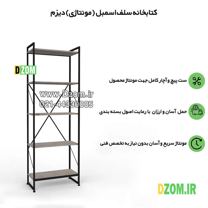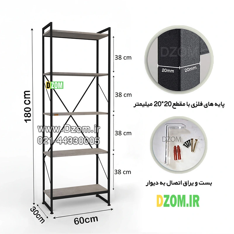 کتابخانه دیزم DZom مدل مونتاژی LIB_60×180_GR محصولی مونتاژی، سبک، شیک و در عین حال جذاب و کارآمد از سری تولیدات دیزم میباشد. مشتری گرامی توجه نمایید برند دیزم (شماره ثبت 414013 اداره ثبت علائم تجاری) هیچگونه نمایندگی فروش در بازارهای فیزیکی و آنلاین نداشته و محصولات خود را با کیفیت و بسته بندی اصلی، مستقیما از طریق سایت Dzom.ir یا شبکه های اجتماعی خود به مصرف کننده (End User) عرضه می نماید. لطفا از خرید کالای تقلبی از سایر فروشندگان خودداری فرمایید. این محصول بصورت سلف اسمبل (مونتاژی) تولید شده است. این کتابخانه حمل و نقل آسان و هزینه حمل مقرون به صرفه ای دارد. از پایه های فلزی با مقطع 20×20 میلیمتر و رنگ رویه الکترواستاتیک با ماندگاری و دوام بالا ساخته شده است. همچنین پایه های پیچی، قابلیت تنظیم نسبت به سطح زمین را دارد تا بهترین تراز جهت جلوگیری از تکان خوردن را ایجاد نماید. صفحات کتابخانه از جنس MDF درجه یک به رنگ طوسی می باشد. این محصول با طول 60cm، عرض 30cm و ارتفاع 180cm عرضه می شود. به این نکته توجه شود که تنوع رنگ انتخابی کالا تنها مربوط به رنگ پایه های فلزی میباشد. توصیه میشود جهت حفظ ایمنی و ثبات بیشتر، محصول در یک یا دو نقطه به دیوار پیچ گردد.(یراق اتصال داخل بسته بندی موجود است).