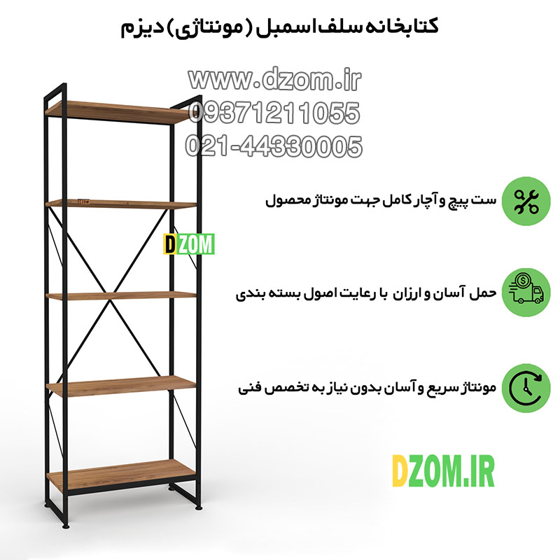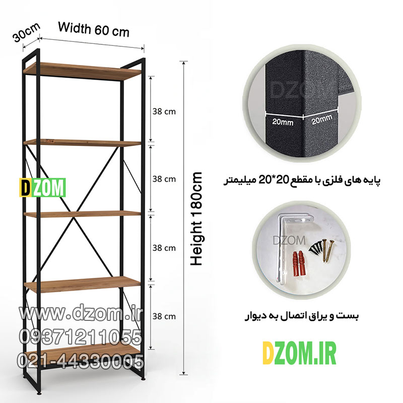 کتابخانه دیزم DZom مدل مونتاژی LIB_60×180_LIGHT محصولی مونتاژی، سبک، شیک و در عین حال جذاب و کارآمد از سری تولیدات دیزم میباشد. مشتری گرامی توجه نمایید برند دیزم (شماره ثبت 414013 اداره ثبت علائم تجاری) هیچگونه نمایندگی فروش در بازارهای فیزیکی و آنلاین نداشته و محصولات خود را با کیفیت و بسته بندی اصلی، مستقیما از طریق سایت Dzom.ir یا شبکه های اجتماعی خود به مصرف کننده (End User) عرضه می نماید. لطفا از خرید کالای تقلبی از سایر فروشندگان خودداری فرمایید. این محصول بصورت سلف اسمبل (مونتاژی) تولید شده است. این کتابخانه حمل و نقل آسان و هزینه حمل مقرون به صرفه ای دارد. از پایه های فلزی با مقطع 20×20 میلیمتر و رنگ رویه الکترواستاتیک با ماندگاری و دوام بالا ساخته شده است. همچنین پایه های پیچی، قابلیت تنظیم نسبت به سطح زمین را دارد تا بهترین تراز جهت جلوگیری از تکان خوردن را ایجاد نماید. صفحات کتابخانه از جنس MDF درجه یک برجسته طرح چوب به رنگ قهوه ای روشن می باشد. این محصول با طول 60cm، عرض 30cm و ارتفاع 180cm عرضه می شود. به این نکته توجه شود که تنوع رنگ انتخابی کالا تنها مربوط به رنگ پایه های فلزی میباشد. توصیه میشود جهت حفظ ایمنی و ثبات بیشتر، محصول در یک یا دو نقطه به دیوار پیچ گردد.(یراق اتصال داخل بسته بندی موجود است).