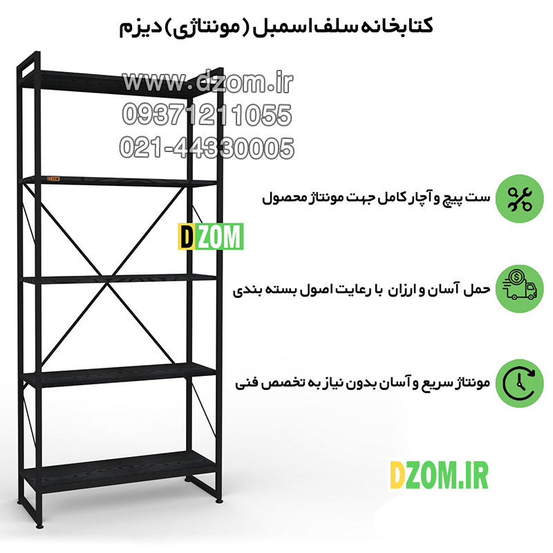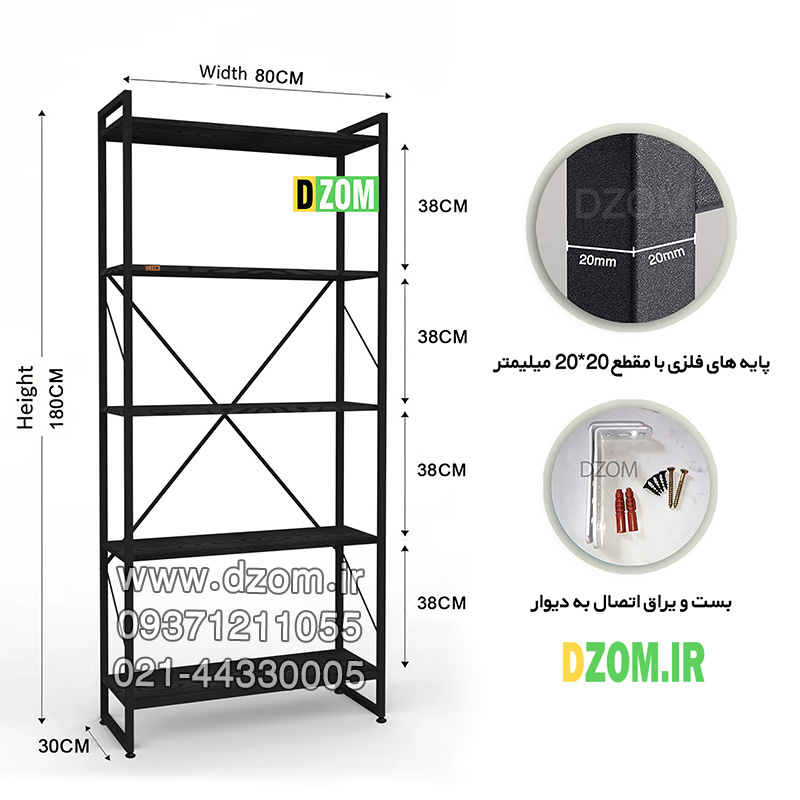 کتابخانه دیزم DZom مدل مونتاژی LIB_80×180_B محصولی مونتاژی، سبک، شیک و در عین حال جذاب و کارآمد از سری تولیدات دیزم میباشد. مشتری گرامی توجه نمایید برند دیزم (شماره ثبت 414013 اداره ثبت علائم تجاری) هیچگونه نمایندگی فروش در بازارهای فیزیکی و آنلاین نداشته و محصولات خود را با کیفیت و بسته بندی اصلی، مستقیما از طریق سایت Dzom.ir یا شبکه های اجتماعی خود به مصرف کننده (End User) عرضه می نماید. لطفا از خرید کالای تقلبی از سایر فروشندگان خودداری فرمایید. این محصول بصورت سلف اسمبل (مونتاژی) تولید شده است. این کتابخانه حمل و نقل آسان و هزینه حمل مقرون به صرفه ای دارد. از پایه های فلزی با مقطع 20×20 میلیمتر و رنگ رویه الکترواستاتیک با ماندگاری و دوام بالا ساخته شده است. همچنین پایه های پیچی، قابلیت تنظیم نسبت به سطح زمین را دارد تا بهترین تراز جهت جلوگیری از تکان خوردن را ایجاد نماید. صفحات کتابخانه از جنس MDF درجه یک برجسته طرح چوب به رنگ مشکی می باشد. این محصول با طول 80cm، عرض 30cm و ارتفاع 180cm عرضه می شود. به این نکته توجه شود که تنوع رنگ انتخابی کالا تنها مربوط به رنگ پایه های فلزی میباشد. توصیه میشود جهت حفظ ایمنی و ثبات بیشتر، محصول در یک یا دو نقطه به دیوار پیچ گردد.(یراق اتصال داخل بسته بندی موجود است).