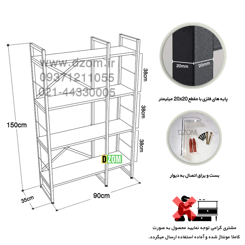 کتابخانه دیزم DZom مدل LIB-54B77-90W محصولی سبک، شیک و در عین حال جذاب و کارآمد از سری تولیدات دیزم میباشد. مشتری گرامی توجه نمایید برند دیزم (شماره ثبت 414013 اداره ثبت علائم تجاری) هیچگونه نمایندگی فروش در بازارهای فیزیکی و آنلاین نداشته و محصولات خود را با کیفیت و بسته بندی اصلی، مستقیما از طریق سایت Dzom.ir یا شبکه های اجتماعی خود به مصرف کننده (End User) عرضه می نماید. لطفا از خرید کالای تقلبی از سایر فروشندگان خودداری فرمایید. این محصول از پایه های فلزی با مقطع 20×20 میلیمتر و رنگ رویه الکترواستاتیک با ماندگاری و دوام بالا ساخته شده است. همچنین پایه های پیچی، قابلیت تنظیم نسبت به سطح زمین را دارد تا بهترین تراز جهت جلوگیری از تکان خوردن را ایجاد نماید. صفحه محصول از جنس MDF درجه یک برجسته طرح چوب به رنگ سفید می باشد. این محصول با طول 90cm، عرض 35cm و ارتفاع 150cmعرضه می شود. به این نکته توجه شود که تنوع رنگ انتخابی کالا تنها مربوط به رنگ پایه های فلزی میباشد و محصول به صورت کاملا مونتاژ شده و آماده استفاده برای مشتریان ارسال می گردد. توصیه میشود جهت حفظ ایمنی و ثبات بیشتر، محصول در یک یا دو نقطه به دیوار پیچ گرد.(یراق اتصال داخل بسته بندی موجود است).