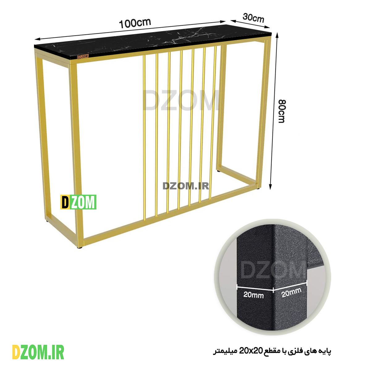 کنسول دیزم DZom مدل CNL_A100_100_SB محصولی سبک، شیک و در عین حال جذاب و کارآمد از سری تولیدات دیزم میباشد. مشتری گرامی توجه نمایید محصولات برند دیزم (شماره ثبت 414013 اداره ثبت علائم تجاری) با کیفیت و بسته بندی اصلی تنها توسط فروشنده رسمی دیزم در دیجی کالا عرضه می گردد، لطفا از خرید کالای تقلبی از سایر فروشندگان خودداری فرمایید. برند دیزم هیچگونه نمایندگی فروش در بازارهای فیزیکی و آنلاین نداشته و محصولات خود را مستقیما از طریق سایت Dzom.ir یا شبکه های اجتماعی خود به مصرف کننده (End user) عرضه می نماید.. این محصول از پایه های فلزی با مقطع 20×20 میلیمتر و رنگ رویه الکترواستاتیک با ماندگاری و دوام بالا ساخته شده است. همچنین پایه های پیچی، قابلیت تنظیم نسبت به سطح زمین را دارد تا بهترین تراز جهت جلوگیری از تکان خوردن را ایجاد نماید. صفحه محصول از جنس MDF درجه یک طرح سنگ و به رنگ مشکی می باشد. این محصول با طول 100cm، عرض 30cm و ارتفاع 80cm عرضه می شود. به این نکته توجه شود که تنوع رنگ انتخابی کالا تنها مربوط به رنگ پایه های فلزی میباشد و محصول به صورت کاملا مونتاژ شده و آماده استفاده برای مشتریان ارسال می گردد.