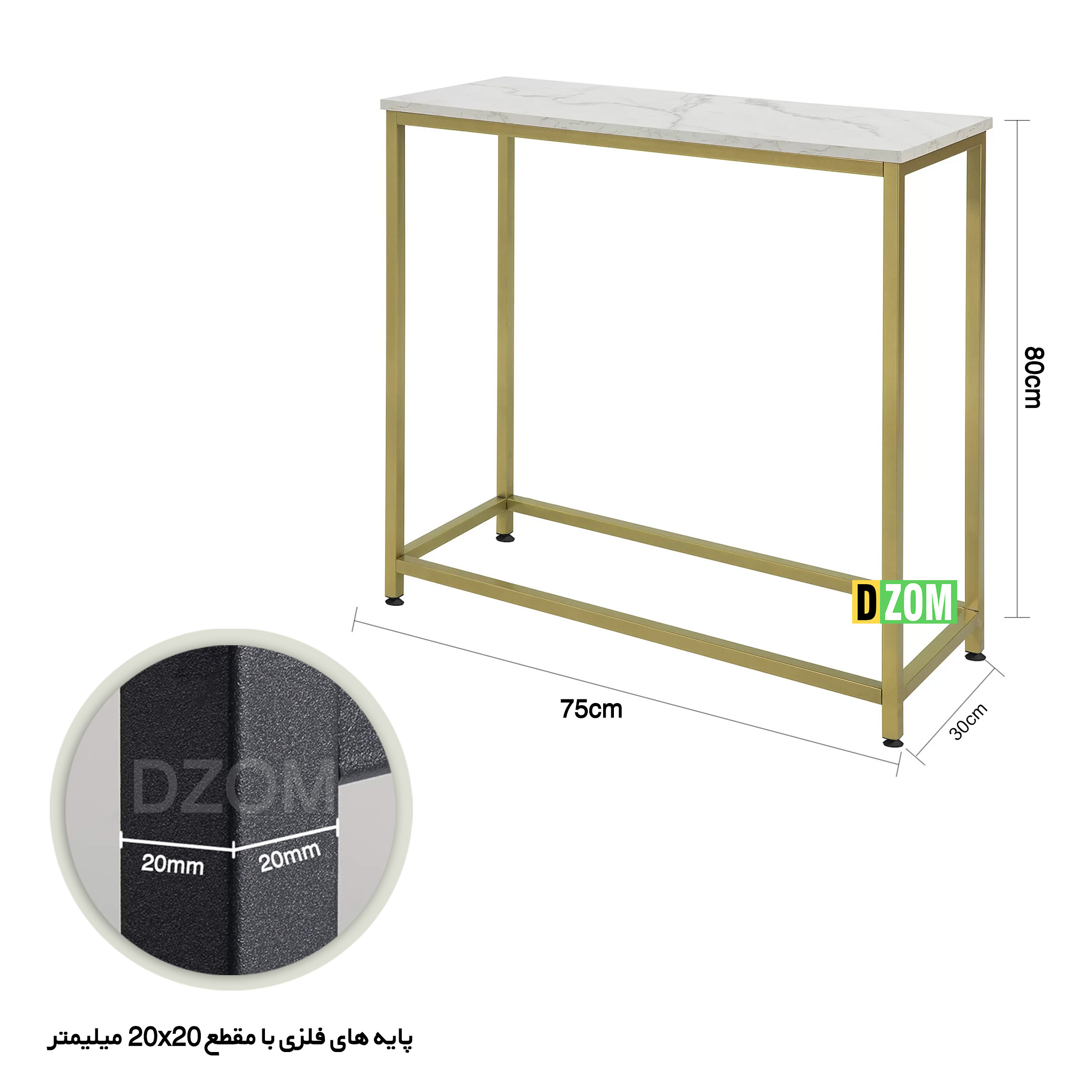 کنسول دیزم DZom مدل CNL_C100_75_SW محصولی سبک، شیک و در عین حال جذاب و کارآمد از سری تولیدات دیزم میباشد. مشتری گرامی توجه نمایید محصولات برند دیزم (شماره ثبت 414013 اداره ثبت علائم تجاری) با کیفیت و بسته بندی اصلی تنها توسط فروشنده رسمی دیزم در دیجی کالا عرضه می گردد، لطفا از خرید کالای تقلبی از سایر فروشندگان خودداری فرمایید. برند دیزم هیچگونه نمایندگی فروش در بازارهای فیزیکی و آنلاین نداشته و محصولات خود را مستقیما از طریق سایت Dzom.ir یا شبکه های اجتماعی خود به مصرف کننده (End user) عرضه می نماید. این محصول از پایه های فلزی با مقطع 20×20 میلیمتر و رنگ رویه الکترواستاتیک با ماندگاری و دوام بالا ساخته شده است. همچنین پایه های پیچی، قابلیت تنظیم نسبت به سطح زمین را دارد تا بهترین تراز جهت جلوگیری از تکان خوردن را ایجاد نماید. صفحه میز از جنس MDF درجه یک طرح سنگ به رنگ سفید می باشد. این محصول با طول 75cm، عرض 30cm و ارتفاع 80cm عرضه می شود. به این نکته توجه شود که تنوع رنگ انتخابی کالا تنها مربوط به رنگ پایه های فلزی میباشد و محصول به صورت کاملا مونتاژ شده و آماده استفاده برای مشتریان ارسال می گردد.