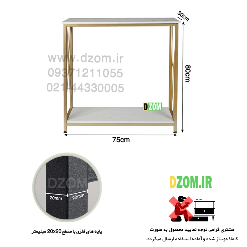 کنسول دیزم DZom مدل CNL_M100_75_W محصولی سبک، شیک و در عین حال جذاب و کارآمد از سری تولیدات دیزم میباشد. مشتری گرامی توجه نمایید برند دیزم هیچگونه نمایندگی فروش در بازارهای فیزیکی و آنلاین نداشته و محصولات خود را با کیفیت و بسته بندی اصلی، مستقیما از طریق سایت Dzom.ir یا شبکه های اجتماعی خود به مصرف کننده (End User) عرضه می نماید. لطفا از خرید کالای تقلبی از سایر فروشندگان خودداری فرمایید. این محصول از پایه های فلزی با مقطع 20×20 میلیمتر و رنگ رویه الکترواستاتیک با ماندگاری و دوام بالا ساخته شده است. همچنین پایه های پیچی، قابلیت تنظیم نسبت به سطح زمین را دارد تا بهترین تراز جهت جلوگیری از تکان خوردن را ایجاد نماید. صفحه محصول از جنس MDF درجه یک برجسته طرح چوب و به رنگ سفید می باشد. این محصول با طول 75cm، عرض 30cm و ارتفاع 80cm عرضه می شود. به این نکته توجه شود که تنوع رنگ انتخابی کالا تنها مربوط به رنگ پایه های فلزی میباشد و محصول به صورت کاملا مونتاژ شده و آماده استفاده برای مشتریان ارسال می گردد.
