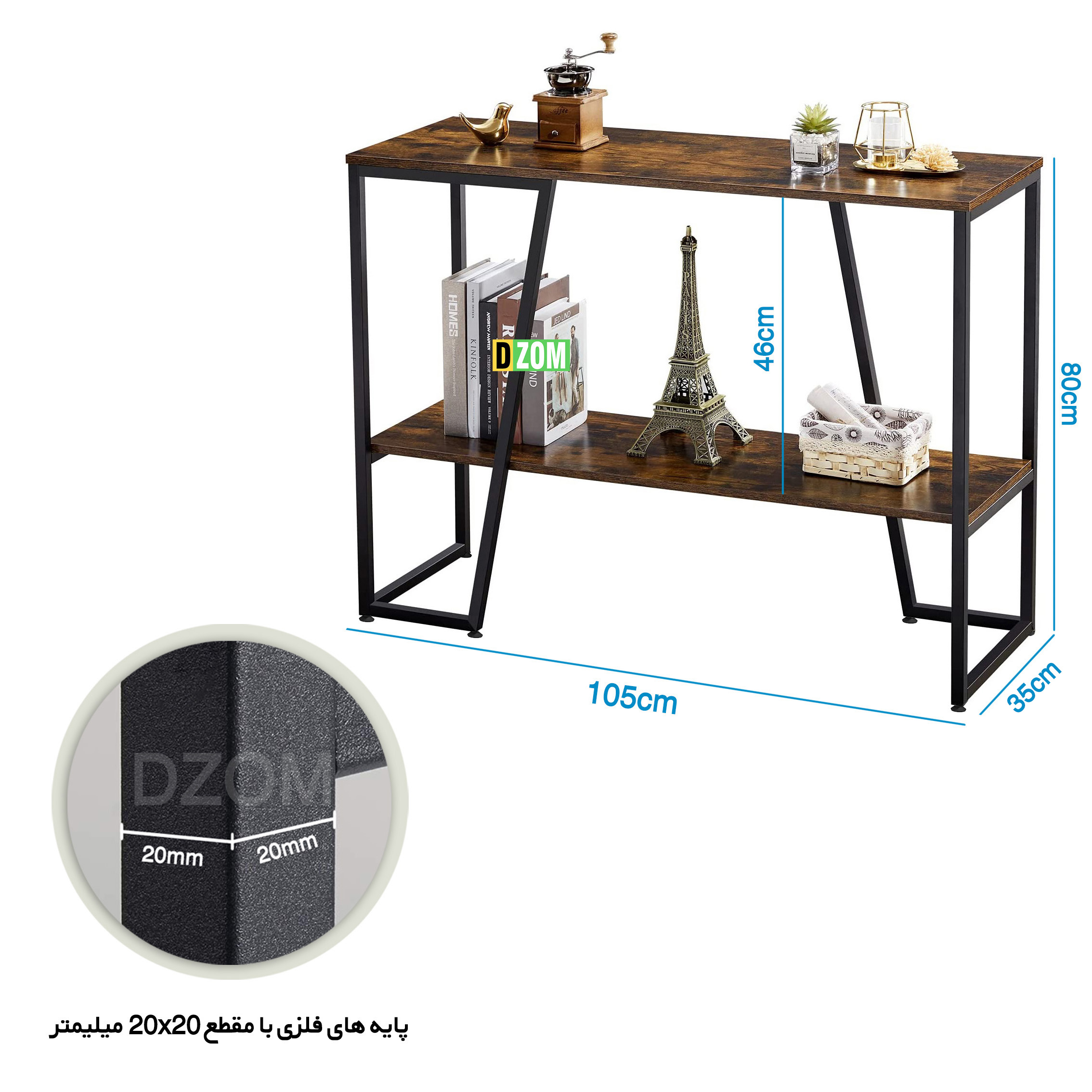 کنسول دیزم DZom مدل CNL_N100_105_BRN محصولی سبک، شیک و در عین حال جذاب و کارآمد از سری تولیدات دیزم میباشد. مشتری گرامی توجه نمایید محصولات برند دیزم (شماره ثبت 414013 اداره ثبت علائم تجاری) با کیفیت و بسته بندی اصلی تنها توسط فروشنده رسمی دیزم در دیجی کالا عرضه می گردد، لطفا از خرید کالای تقلبی از سایر فروشندگان خودداری فرمایید. برند دیزم هیچگونه نمایندگی فروش در بازارهای فیزیکی و آنلاین نداشته و محصولات خود را مستقیما از طریق سایت Dzom.ir یا شبکه های اجتماعی خود به مصرف کننده (End user) عرضه می نماید. این محصول از پایه های فلزی با مقطع 20×20 میلیمتر و رنگ رویه الکترواستاتیک با ماندگاری و دوام بالا ساخته شده است. همچنین پایه های پیچی، قابلیت تنظیم نسبت به سطح زمین را دارد تا بهترین تراز جهت جلوگیری از تکان خوردن را ایجاد نماید. صفحه میز از جنس MDF درجه یک برجسته طرح چوب به رنگ قهوه ای می باشد. این محصول با طول 105cm، عرض 35cm و ارتفاع 80cm عرضه می شود. به این نکته توجه شود که تنوع رنگ انتخابی کالا تنها مربوط به رنگ پایه های فلزی میباشد و محصول به صورت کاملا مونتاژ شده و آماده استفاده برای مشتریان ارسال می گردد.